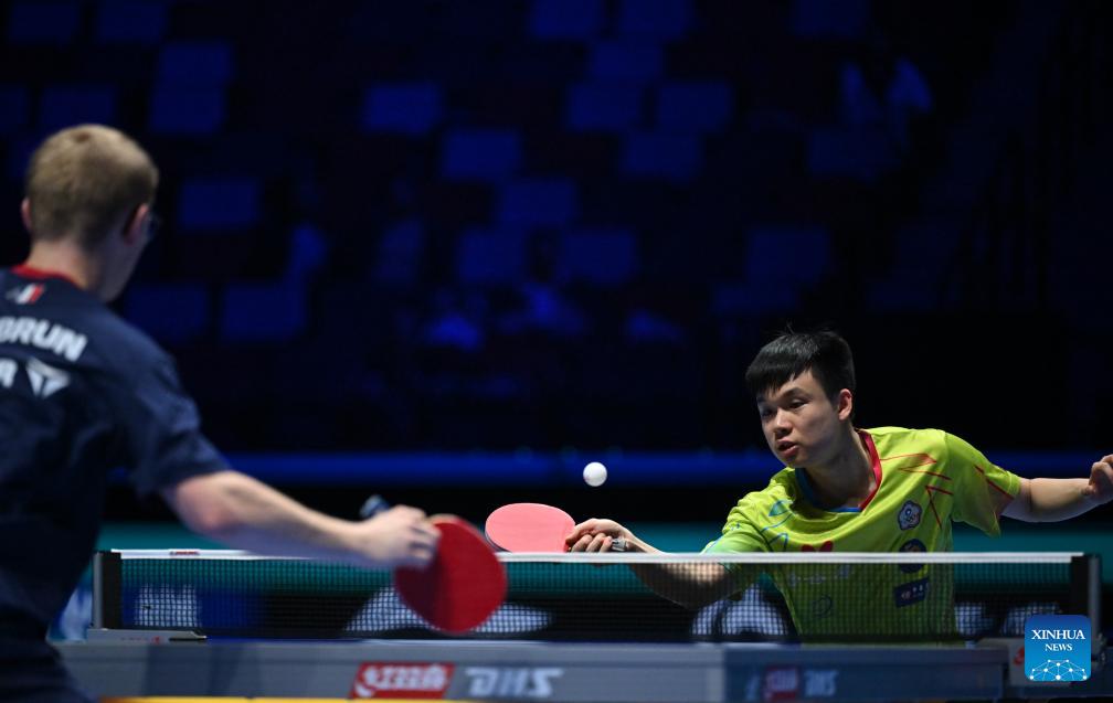 Feng Yi-hsin (R) of Chinese Taipei competes during the men's singles group 7 match between Felix Lebrun of France and Feng Yi-hsin of Chinese Taipei at the ITTF Men's and Women's World Cup 2026 in Macao, China, March 31, 2026. (Xinhua/Yu Yang)
