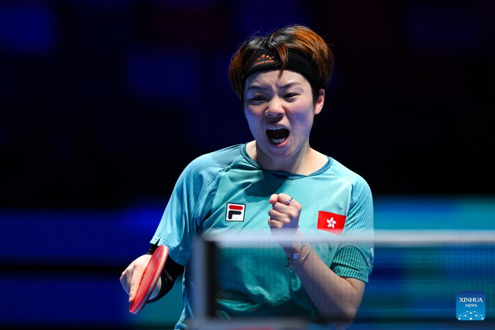 Doo Hoi Kem of China's Hong Kong celebrates scoring during the women's singles group 6 match between Doo Hoi Kem of China's Hong Kong and Natalia Bajor of Poland at the ITTF Men's and Women's World Cup 2026 in Macao, China, March 31, 2026. (Xinhua/Cheong Kam Ka)