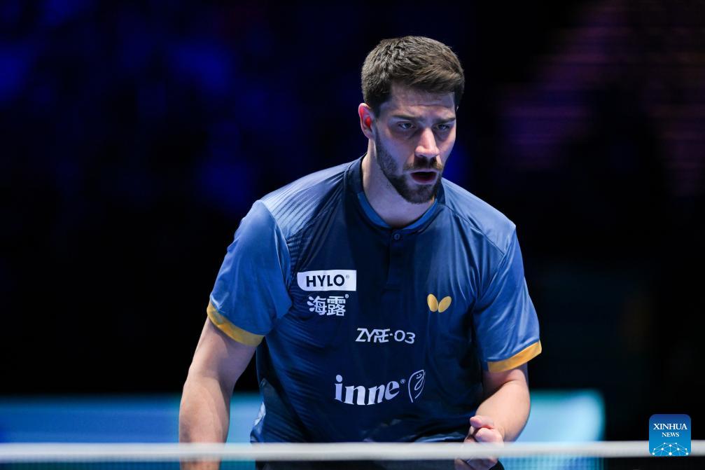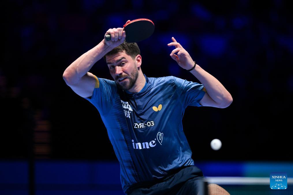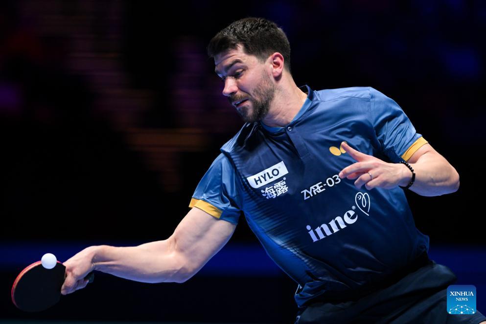 Patrick Franziska hits a return during the men's singles group match between Zhou Qihao of China and Patrick Franziska of Germany at the ITTF Men's and Women's World Cup 2026 in Macao, China, April 1, 2026. (Xinhua/Cheong Kam Ka)