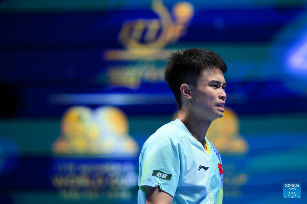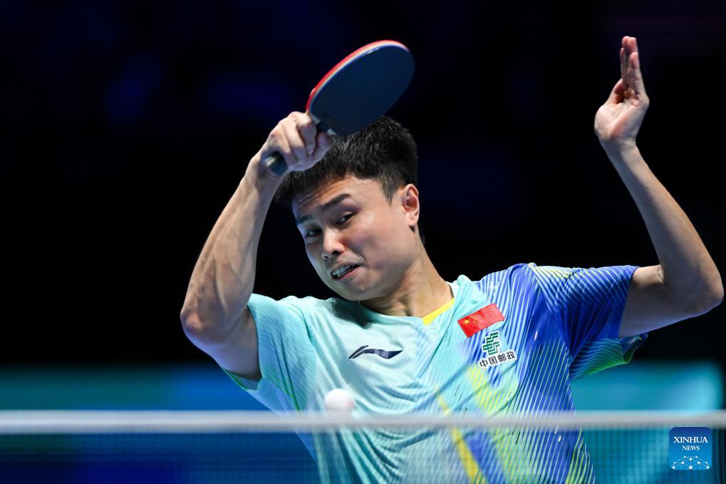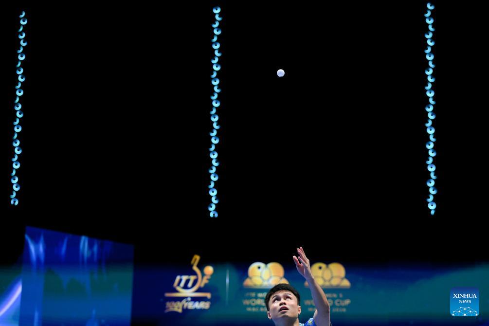 Zhou Qihao hits a return during the men's singles group match between Zhou Qihao of China and Patrick Franziska of Germany at the ITTF Men's and Women's World Cup 2026 in Macao, China, April 1, 2026. (Xinhua/Cheong Kam Ka)