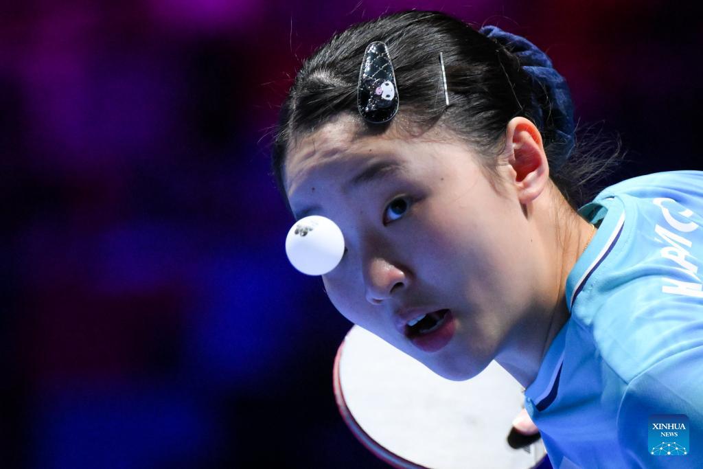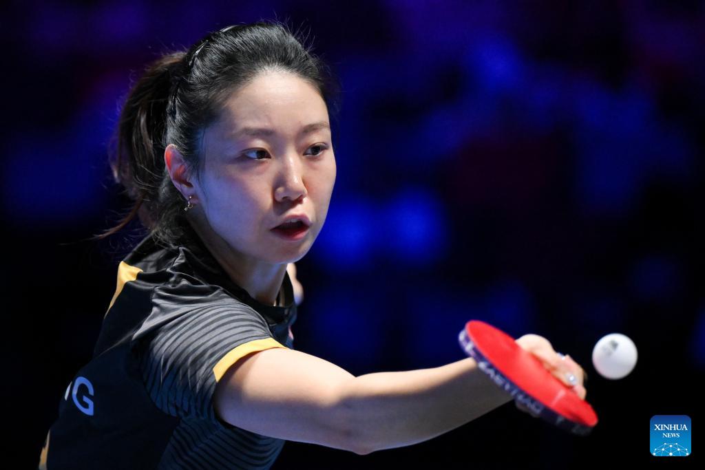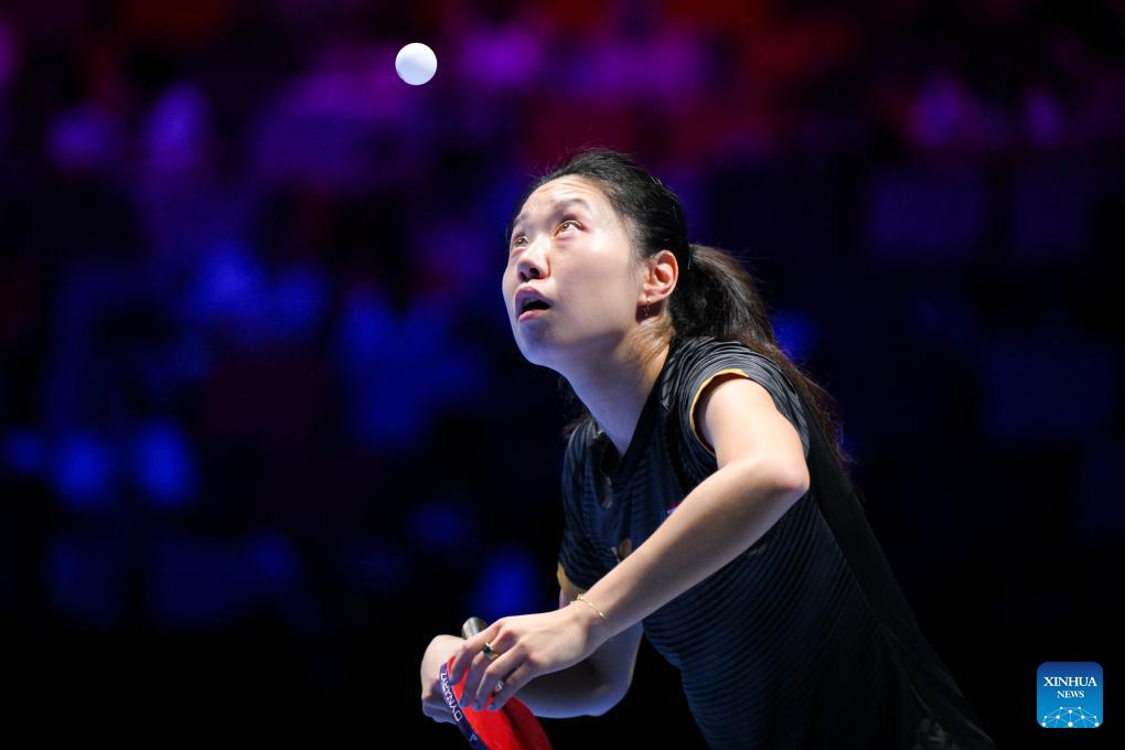 Lily Zhang hits a return during the women's singles group match between Harimoto Miwa of Japan and Lily Zhang of the United States at the ITTF Men's and Women's World Cup 2026 in Macao, China, April 1, 2026. (Xinhua/Cheong Kam Ka)