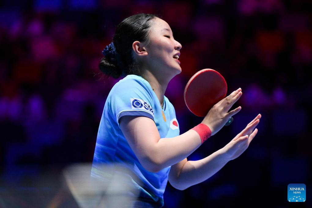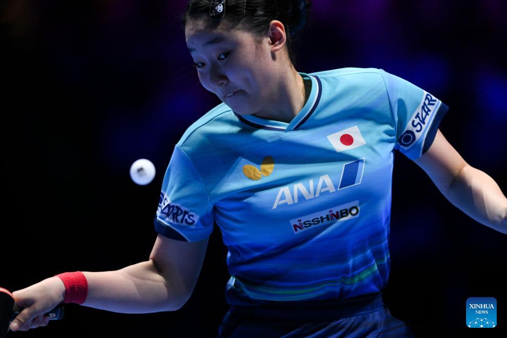 Harimoto Miwa hits a return during the women's singles group match between Harimoto Miwa of Japan and Lily Zhang of the United States at the ITTF Men's and Women's World Cup 2026 in Macao, China, April 1, 2026. (Xinhua/Cheong Kam Ka)