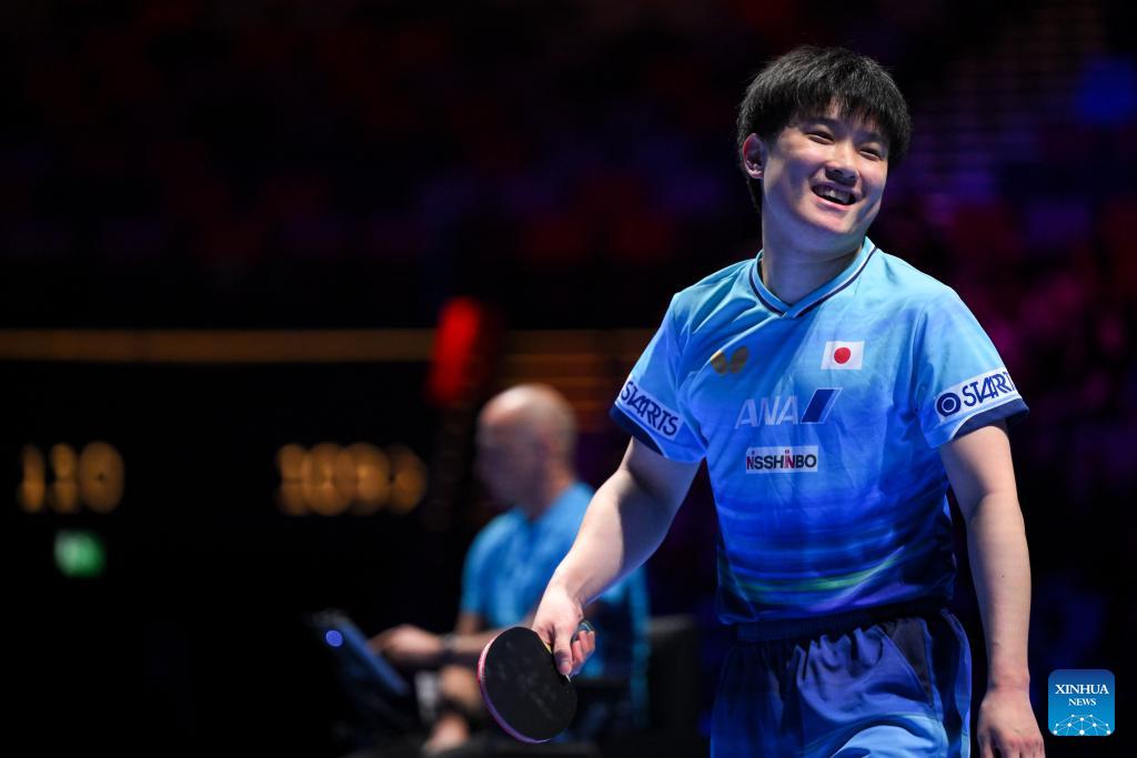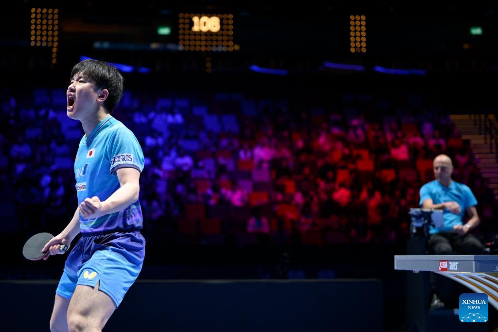 Harimoto Tomokazu (L) of Japan celebrates scoring during the men's singles round of 16 match between Harimoto Tomokazu of Japan and Qiu Dang of Germany at the ITTF Men's and Women's World Cup 2026 in Macao, China, April 2, 2026. (Xinhua/Yu Yang)