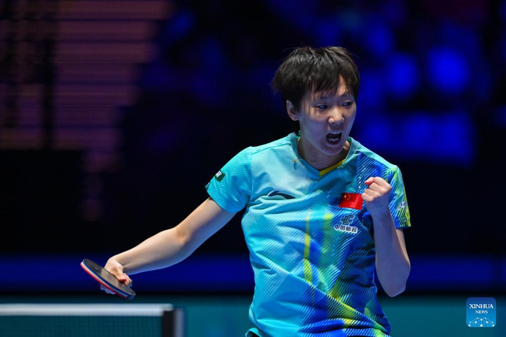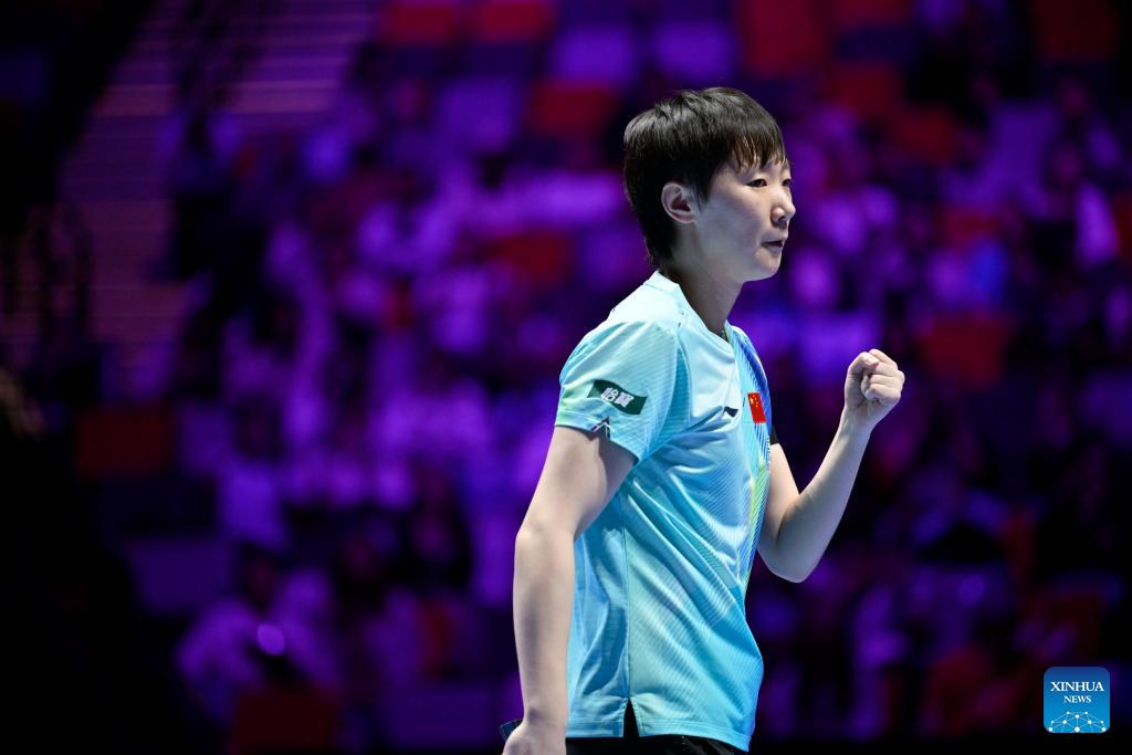 Qin Yuxuan of China reacts during the women's singles round of 16 match between Qin Yuxuan of China and Sabine Winter of Germany at the ITTF Men's and Women's World Cup 2026 in Macao, China, April 2, 2026. (Xinhua/Yu Yang)