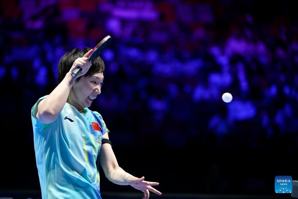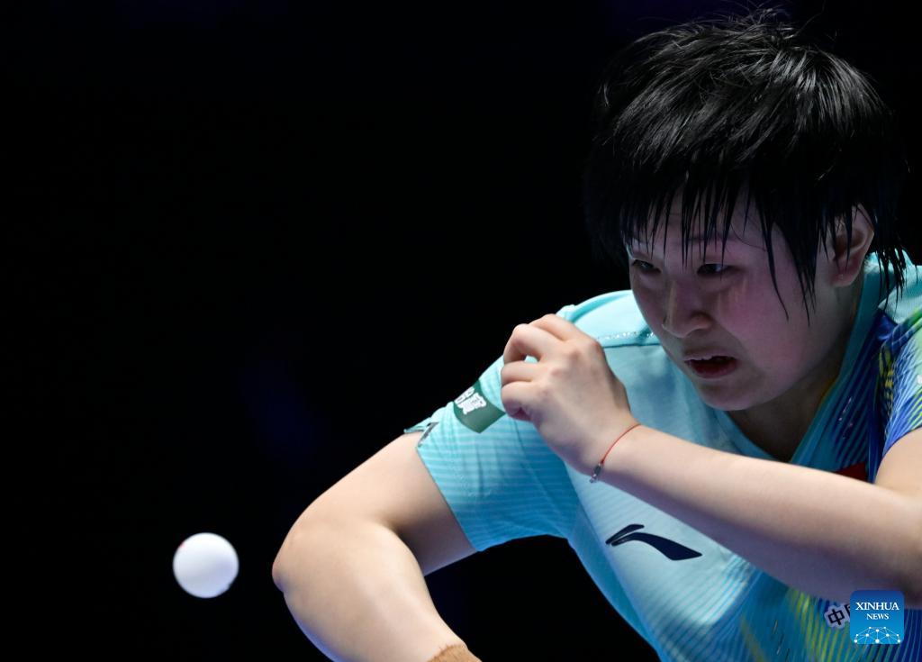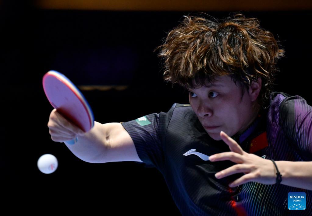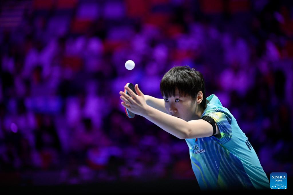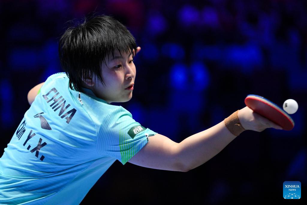 Qin Yuxuan of China hits a return during the women's singles round of 16 match between Qin Yuxuan of China and Sabine Winter of Germany at the ITTF Men's and Women's World Cup 2026 in Macao, China, April 2, 2026. (Xinhua/Cheong Kam Ka)