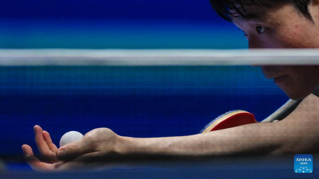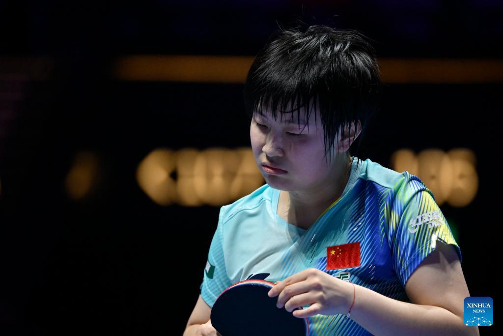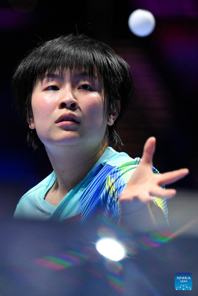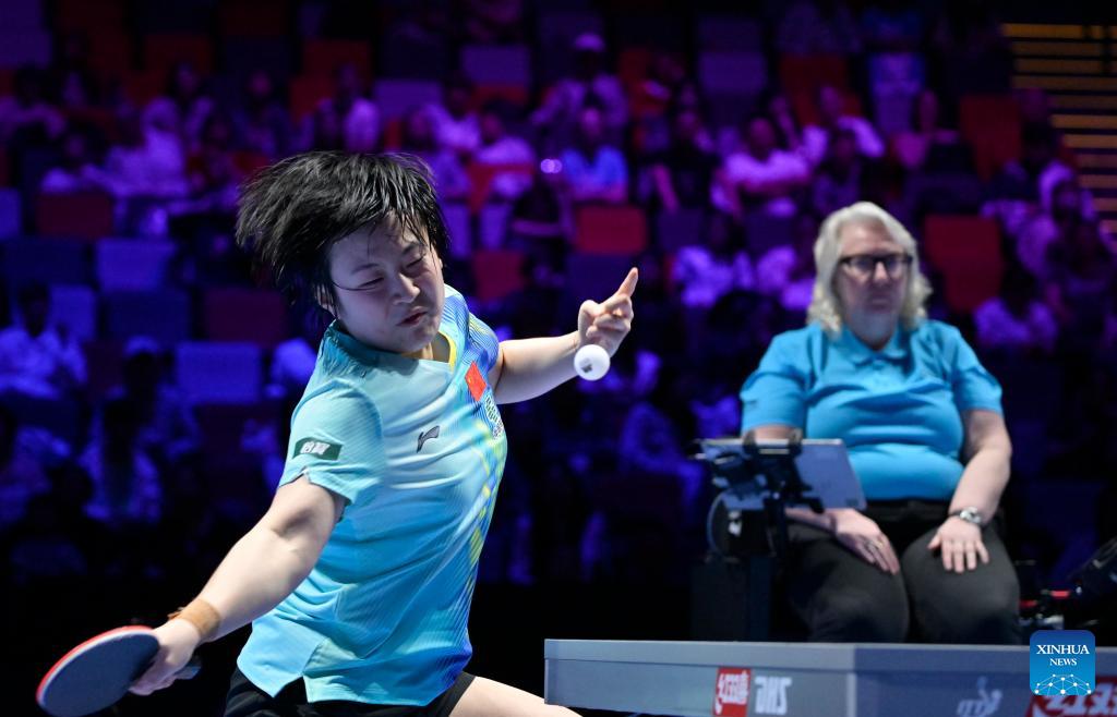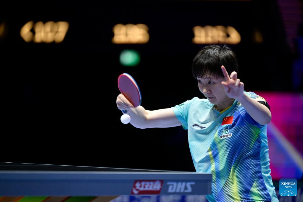 Qin Yuxuan of China hits a return during the women's singles round of 16 match between Qin Yuxuan of China and Sabine Winter of Germany at the ITTF Men's and Women's World Cup 2026 in Macao, China, April 2, 2026. (Xinhua/Cheong Kam Ka)