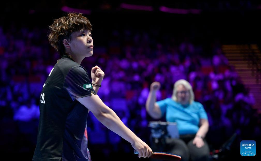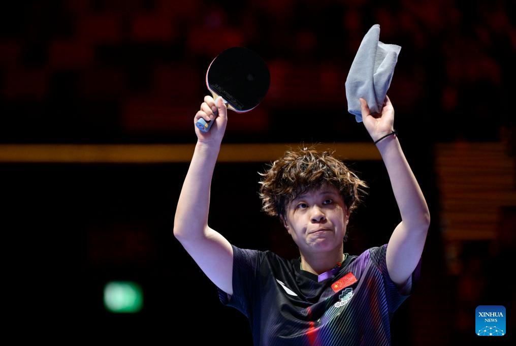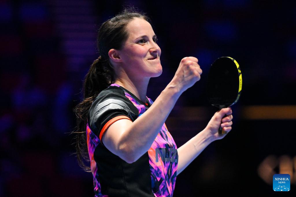 Sabine Winter of Germany celebrates after winning the women's singles round of 16 match between Qin Yuxuan of China and Sabine Winter of Germany at the ITTF Men's and Women's World Cup 2026 in Macao, China, April 2, 2026. (Xinhua/Cheong Kam Ka)