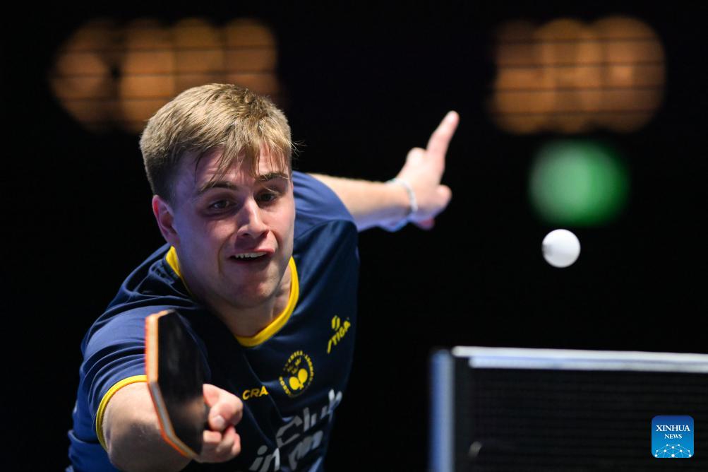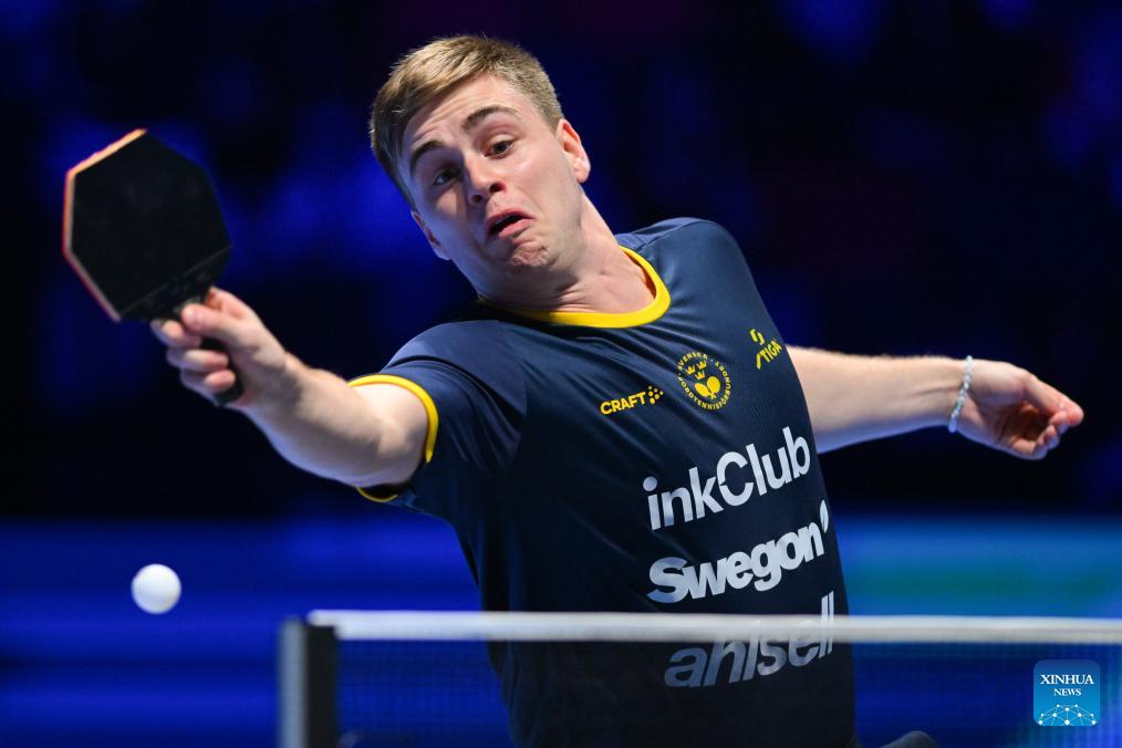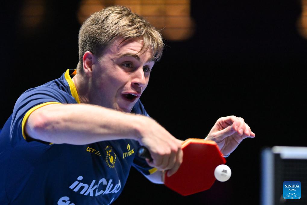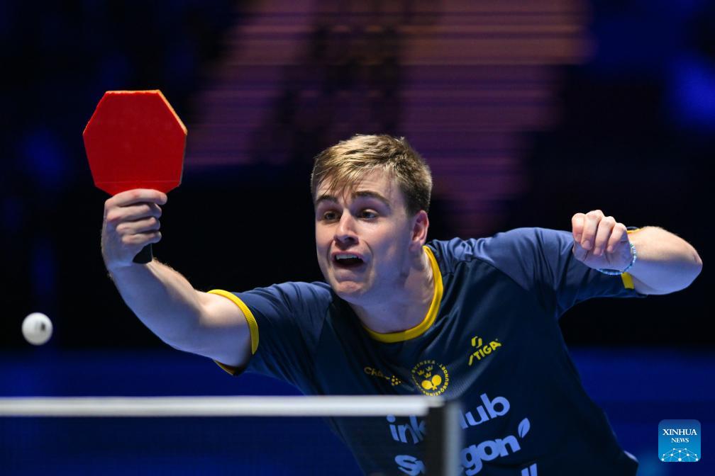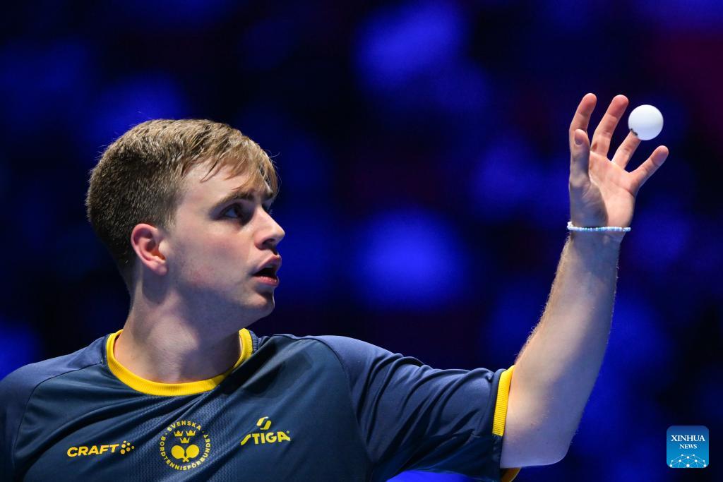 Truls Moregard competes during the men's singles round of 16 match between Truls Moregard of Sweden and Patrick Franziska of Germany at the ITTF Men's and Women's World Cup 2026 in Macao, China, April 2, 2026. (Xinhua/Cheong Kam Ka)