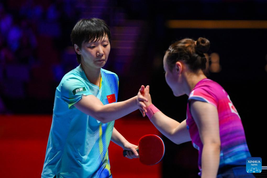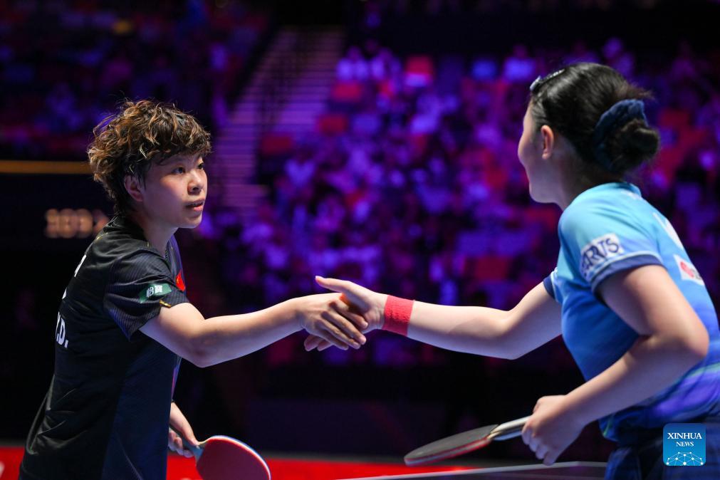Wang Manyu (L) of China greets with Ito Mima of Japan after their women's singles round of 16 match at the ITTF Men's and Women's World Cup 2026 in Macao, China, April 2, 2026. (Xinhua/Cheong Kam Ka)