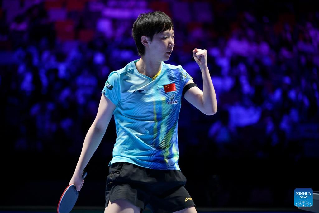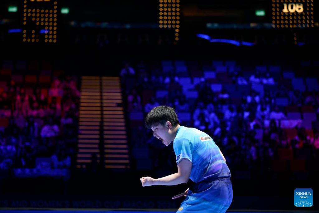 Wang Manyu of China celebrates scoring during the women's singles round of 16 match between Wang Manyu of China and Ito Mima of Japan at the ITTF Men's and Women's World Cup 2026 in Macao, China, April 2, 2026. (Xinhua/Yu Yang)