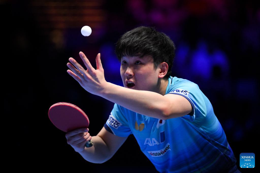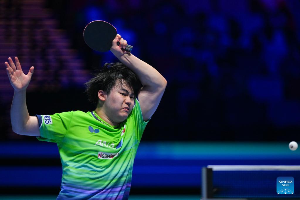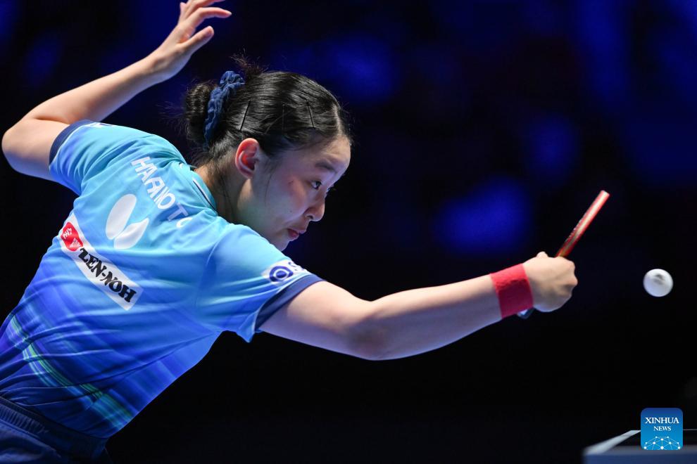 Harimoto Miwa hits a return during the women's singles round of 16 match between Wang Yidi of China and Harimoto Miwa of Japan at the ITTF Men's and Women's World Cup 2026 in Macao, China, April 2, 2026. (Xinhua/Cheong Kam Ka)