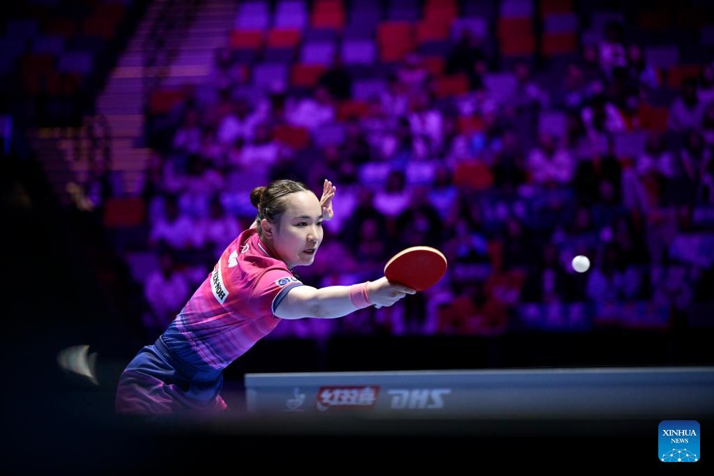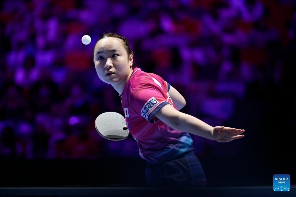 Ito Mima of Japan hits a return during the women's singles round of 16 match between Wang Manyu of China and Ito Mima of Japan at the ITTF Men's and Women's World Cup 2026 in Macao, China, April 2, 2026. (Xinhua/Yu Yang)