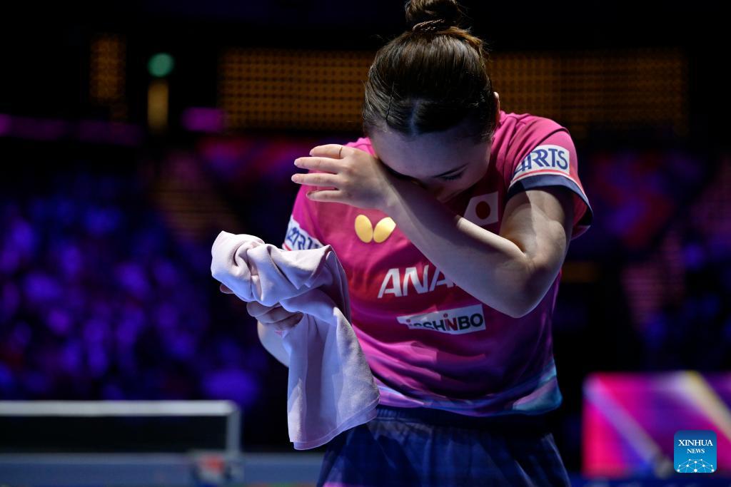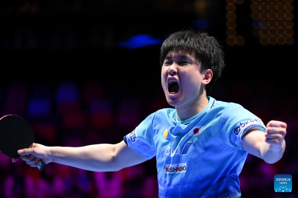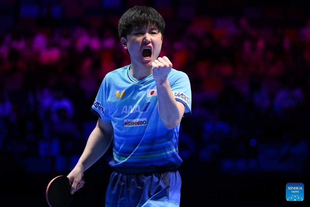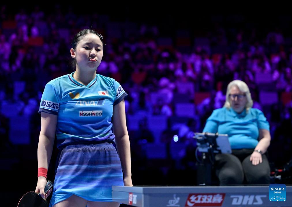 Ito Mima of Japan reacts during the women's singles round of 16 match between Wang Manyu of China and Ito Mima of Japan at the ITTF Men's and Women's World Cup 2026 in Macao, China, April 2, 2026. (Xinhua/Yu Yang)