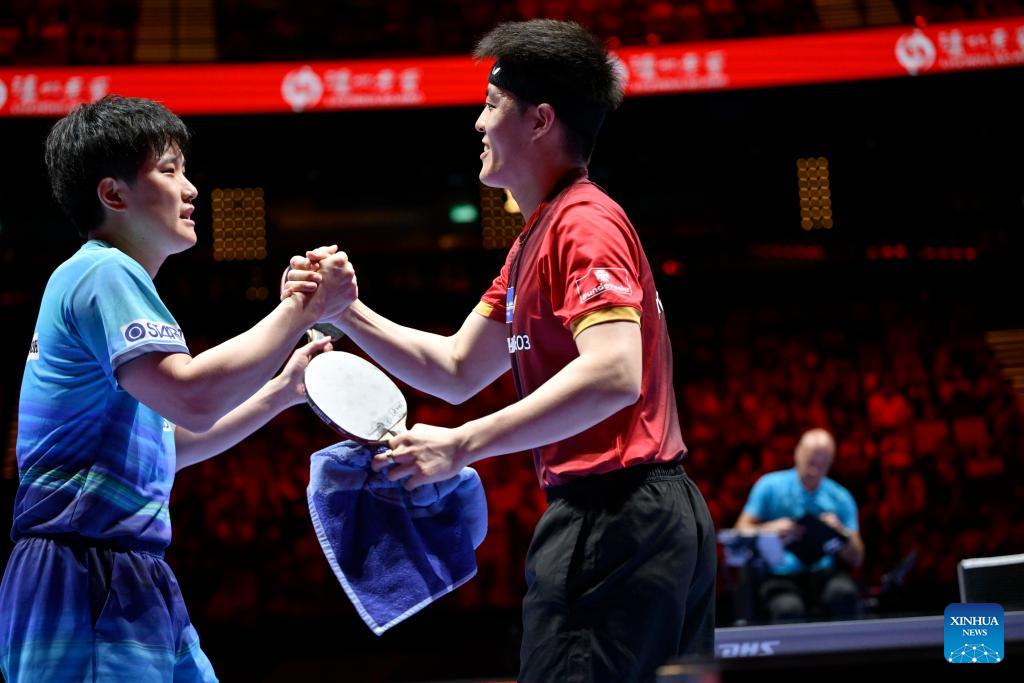 Harimoto Tomokazu (L) of Japan greets with Qiu Dang of Germany after their men's singles round of 16 match at the ITTF Men's and Women's World Cup 2026 in Macao, China, April 2, 2026. (Xinhua/Yu Yang)