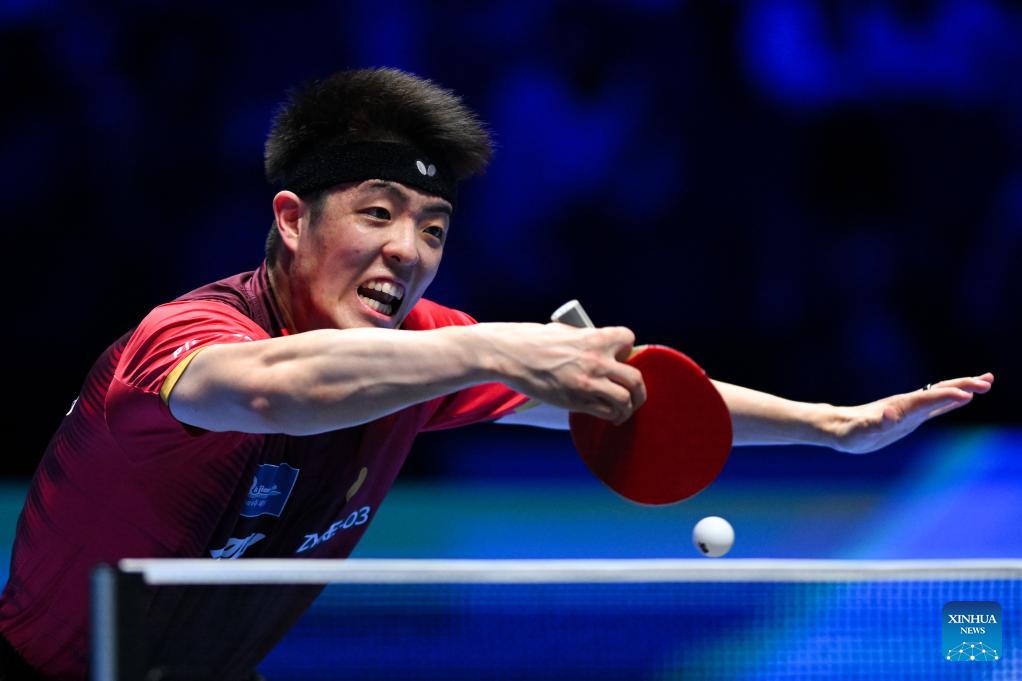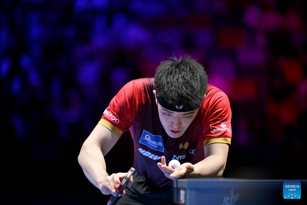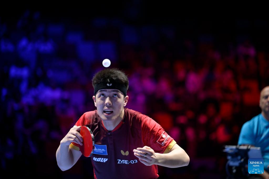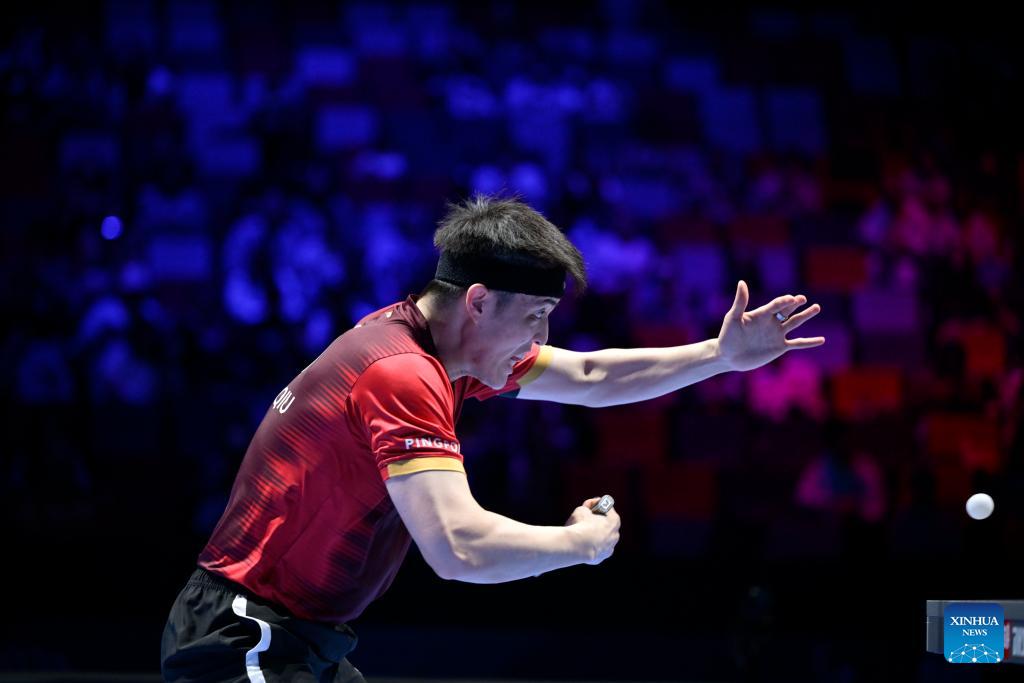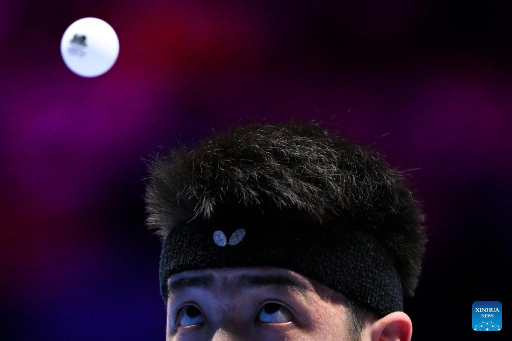 Qiu Dang of Germany hits a return during the men's singles round of 16 match between Harimoto Tomokazu of Japan and Qiu Dang of Germany at the ITTF Men's and Women's World Cup 2026 in Macao, China, April 2, 2026. (Xinhua/Yu Yang)