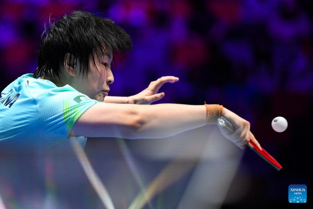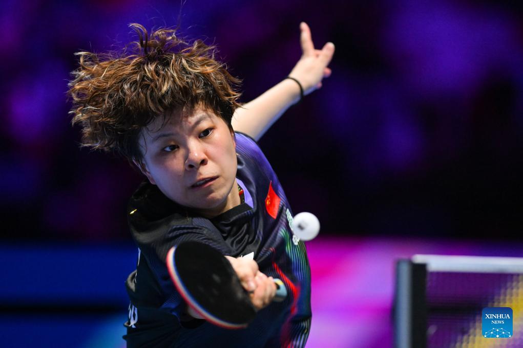 Wang Manyu of China hits a return during the women's singles round of 16 match between Wang Manyu of China and Ito Mima of Japan at the ITTF Men's and Women's World Cup 2026 in Macao, China, April 2, 2026. (Xinhua/Yu Yang)
