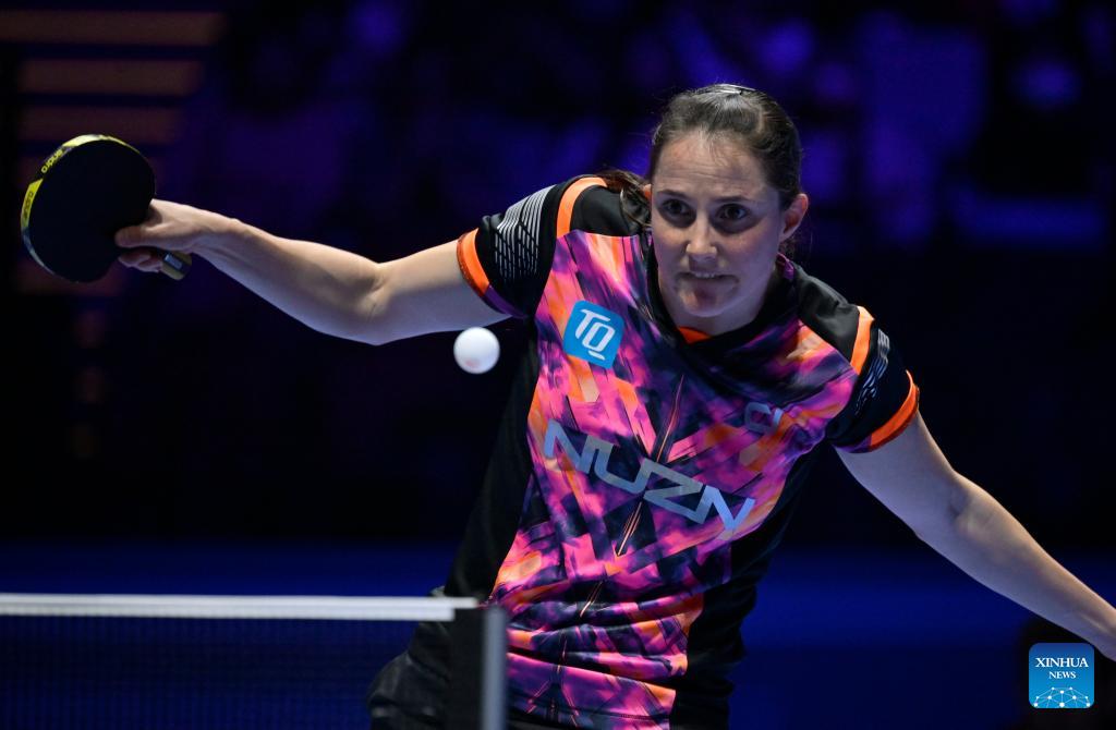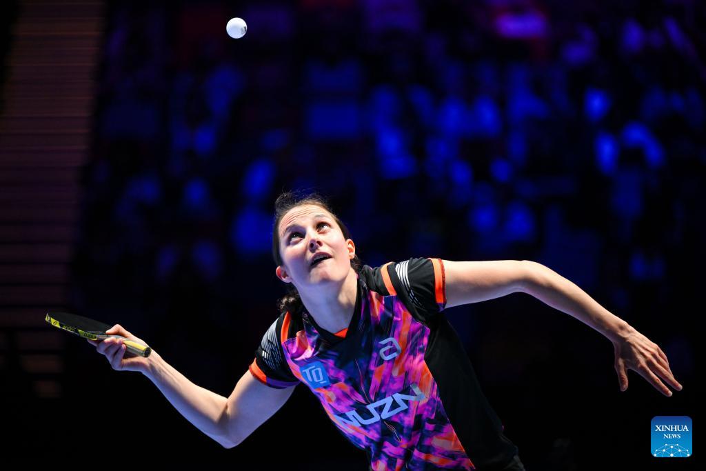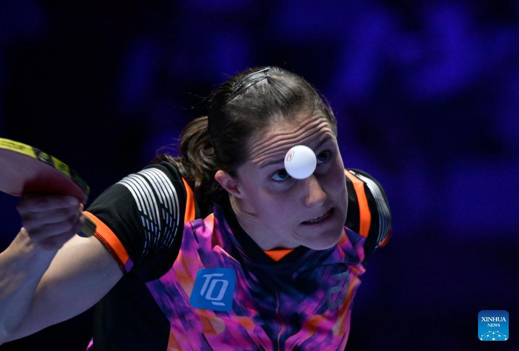 Sabine Winter of Germany hits a return during the women's singles round of 16 match between Qin Yuxuan of China and Sabine Winter of Germany at the ITTF Men's and Women's World Cup 2026 in Macao, China, April 2, 2026. (Xinhua/Yu Yang)