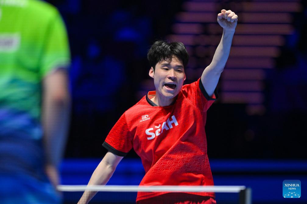Jang Woojin of South Korea celebrates scoring during the men's singles round of 16 match between Matsushima Sora of Japan and Jang Woojin of South Korea at the ITTF Men's and Women's World Cup 2026 in Macao, China, April 2, 2026. (Xinhua/Cheong Kam Ka)
