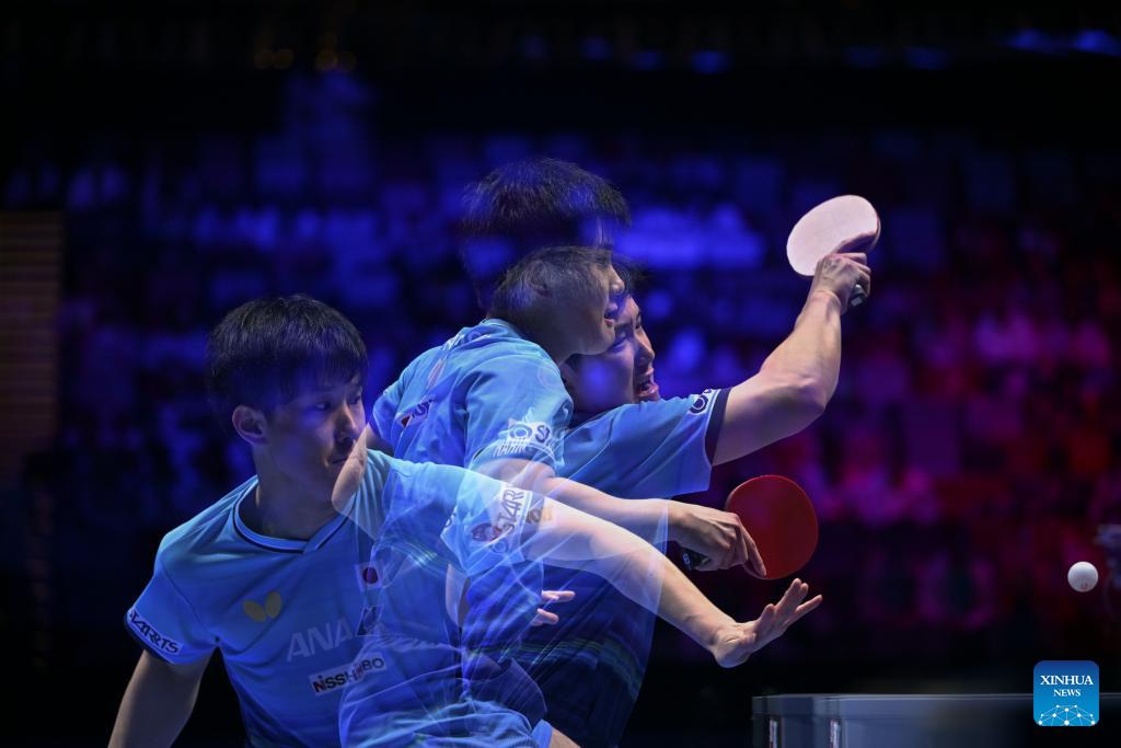 This multi-exposure photo shows Harimoto Tomokazu of Japan hitting a return during the men's singles round of 16 match between Harimoto Tomokazu of Japan and Qiu Dang of Germany at the ITTF Men's and Women's World Cup 2026 in Macao, China, April 2, 2026. (Xinhua/Yu Yang)