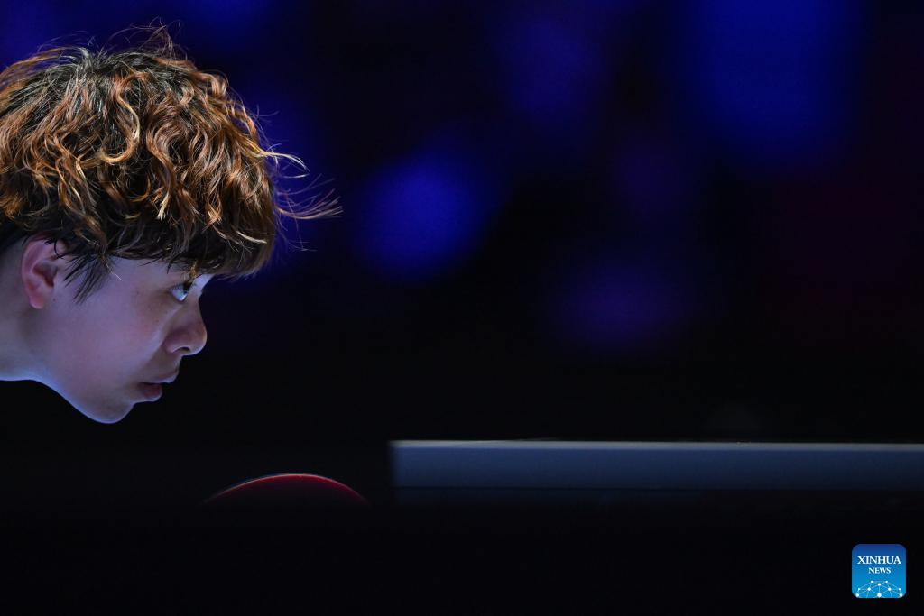 Wang Yidi reacts during the women's singles round of 16 match between Wang Yidi of China and Harimoto Miwa of Japan at the ITTF Men's and Women's World Cup 2026 in Macao, China, April 2, 2026. (Xinhua/Cheong Kam Ka)