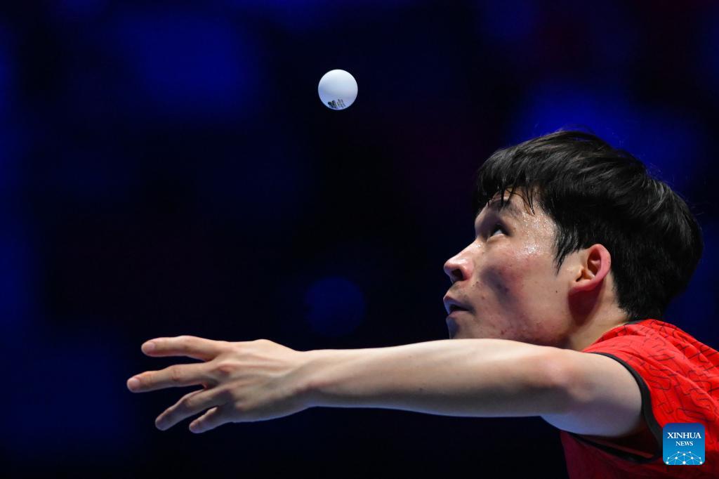 Jang Woojin of South Korea serves during the men's singles round of 16 match between Matsushima Sora of Japan and Jang Woojin of South Korea at the ITTF Men's and Women's World Cup 2026 in Macao, China, April 2, 2026. (Xinhua/Cheong Kam Ka)