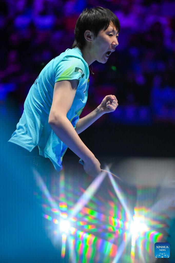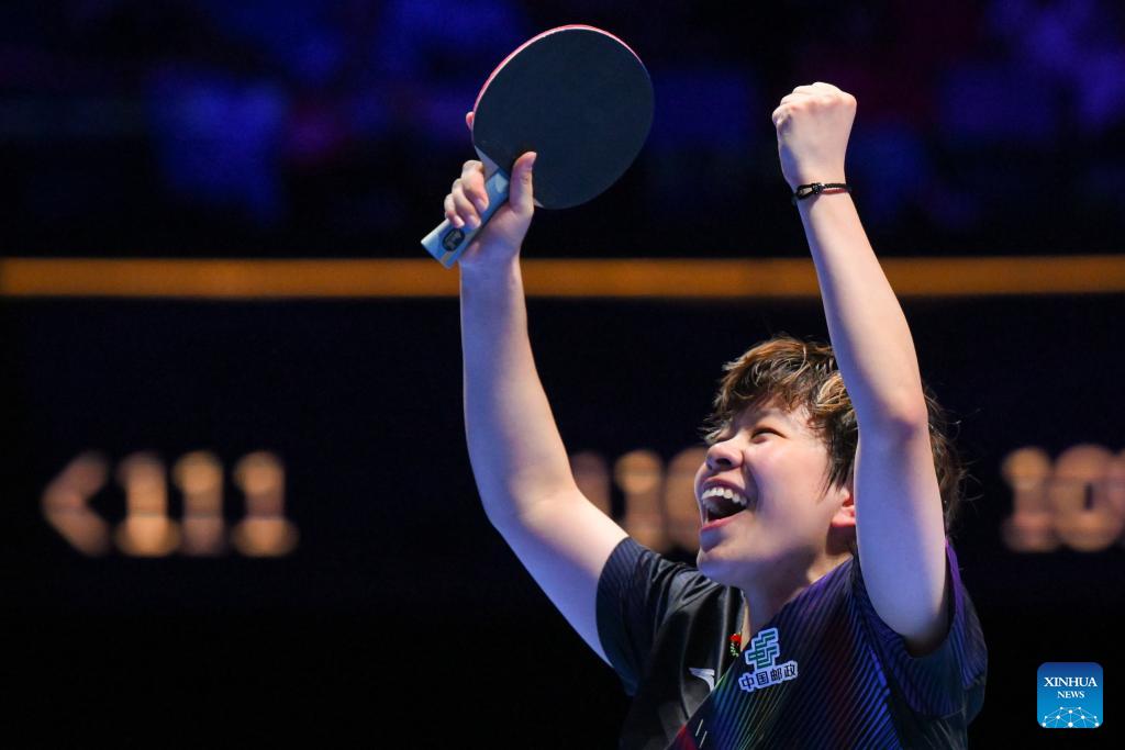 Wang Yidi celebrates after the women's singles round of 16 match between Wang Yidi of China and Harimoto Miwa of Japan at the ITTF Men's and Women's World Cup 2026 in Macao, China, April 2, 2026. (Xinhua/Cheong Kam Ka)