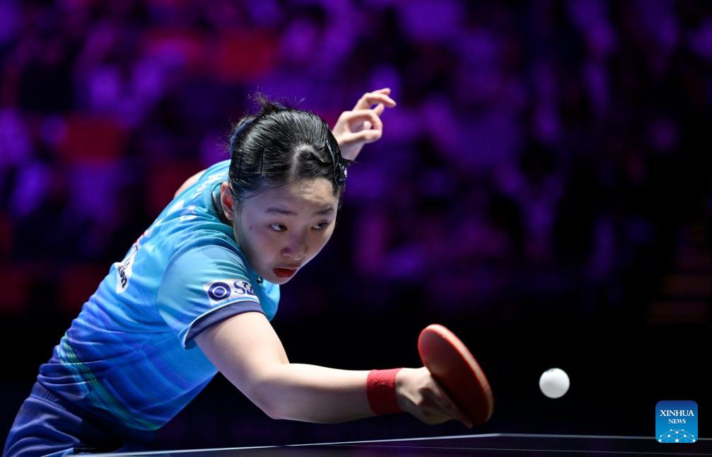 Qin Yuxuan of China hits a return during the women's singles round of 16 match between Qin Yuxuan of China and Sabine Winter of Germany at the ITTF Men's and Women's World Cup 2026 in Macao, China, April 2, 2026. (Xinhua/Yu Yang)