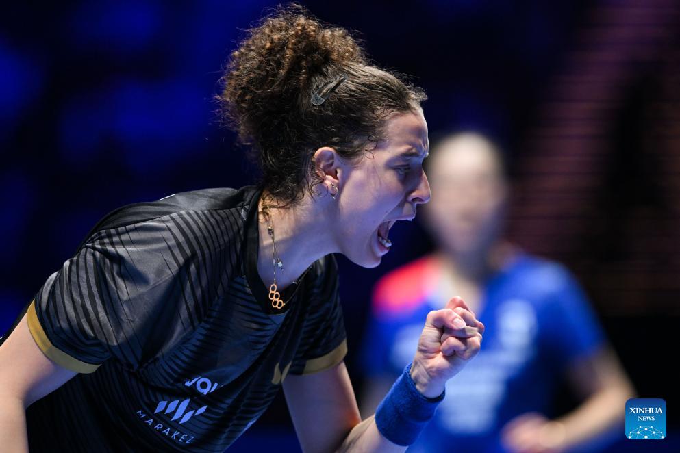 Hana Goda reacts during the women's singles round of 16 match between Hana Goda of Egypt and Yuan Jia Nan of France at the ITTF Men's and Women's World Cup 2026 in Macao, China, April 3, 2026. (Xinhua/Yu Yang)
