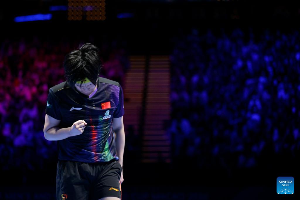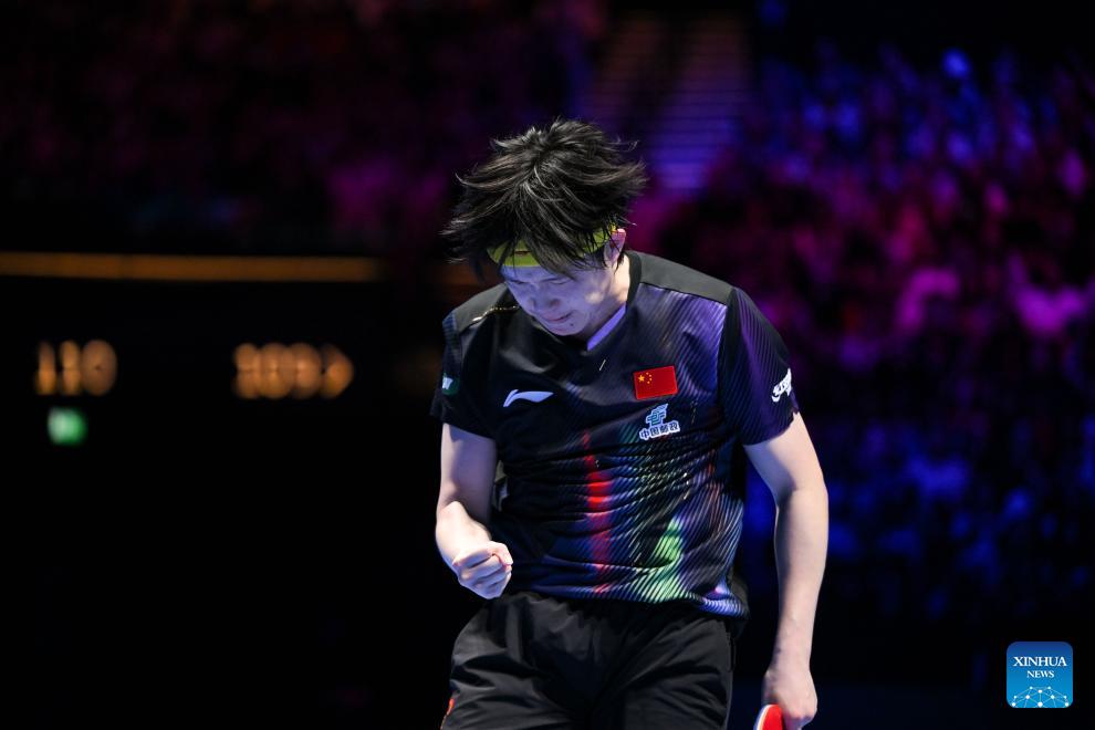 Wang Chuqin celebrates during the men's singles round of 16 match between Wang Chuqin of China and Felix Lebrun of France at the ITTF Men's and Women's World Cup 2026 in Macao, China, April 3, 2026. (Xinhua/Yu Yang)