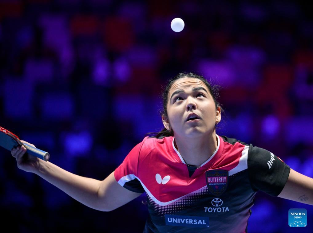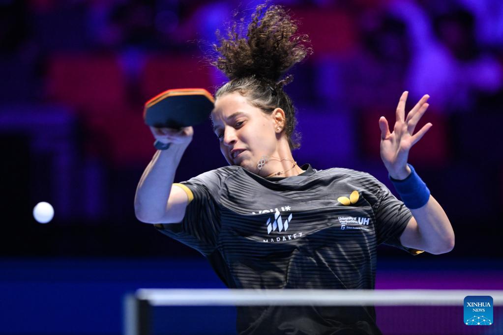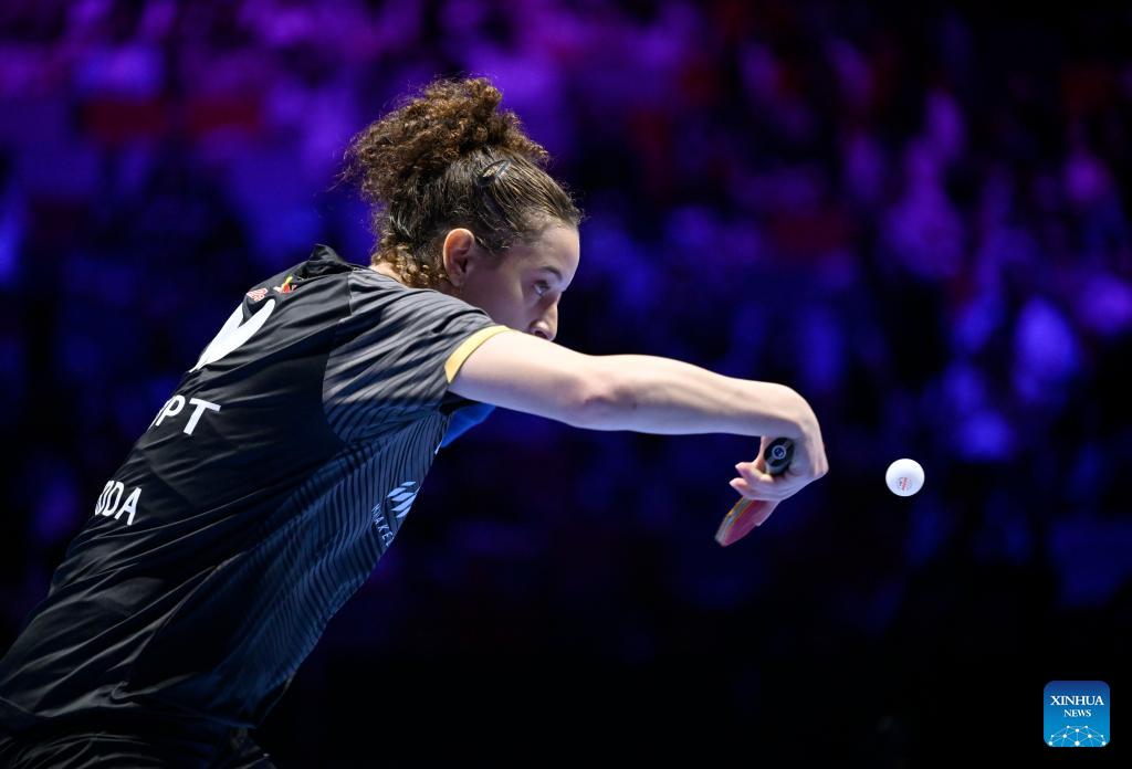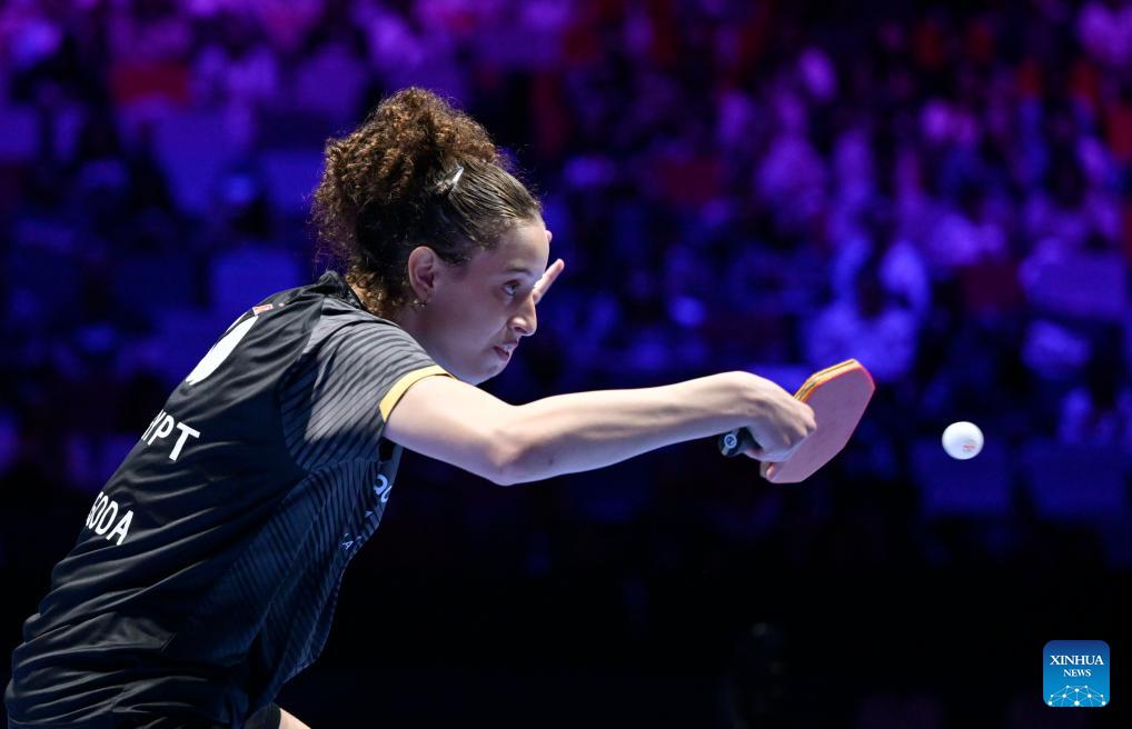 Hana Goda competes during the women's singles round of 16 match between Hana Goda of Egypt and Yuan Jia Nan of France at the ITTF Men's and Women's World Cup 2026 in Macao, China, April 3, 2026. (Xinhua/Cheong Kam Ka)