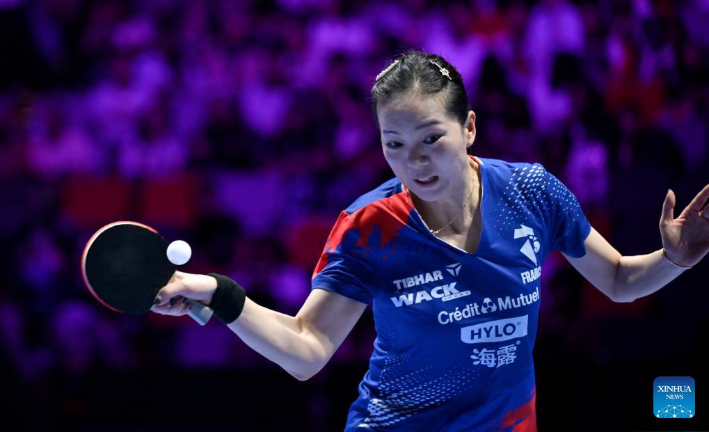 Yuan Jia Nan hits a return during the women's singles round of 16 match between Hana Goda of Egypt and Yuan Jia Nan of France at the ITTF Men's and Women's World Cup 2026 in Macao, China, April 3, 2026. (Xinhua/Yu Yang)