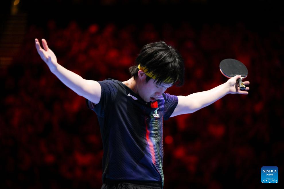 Wang Chuqin celebrates after the men's singles round of 16 match between Wang Chuqin of China and Felix Lebrun of France at the ITTF Men's and Women's World Cup 2026 in Macao, China, April 3, 2026. (Xinhua/Cheong Kam Ka)