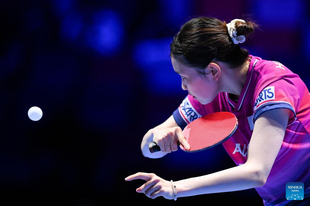 Shin Yubin hits a return during the women's singles round of 16 match between Han Ying of Germany and Shin Yubin of South Korea at the ITTF Men's and Women's World Cup 2026 in Macao, China, April 3, 2026. (Xinhua/Yu Yang)