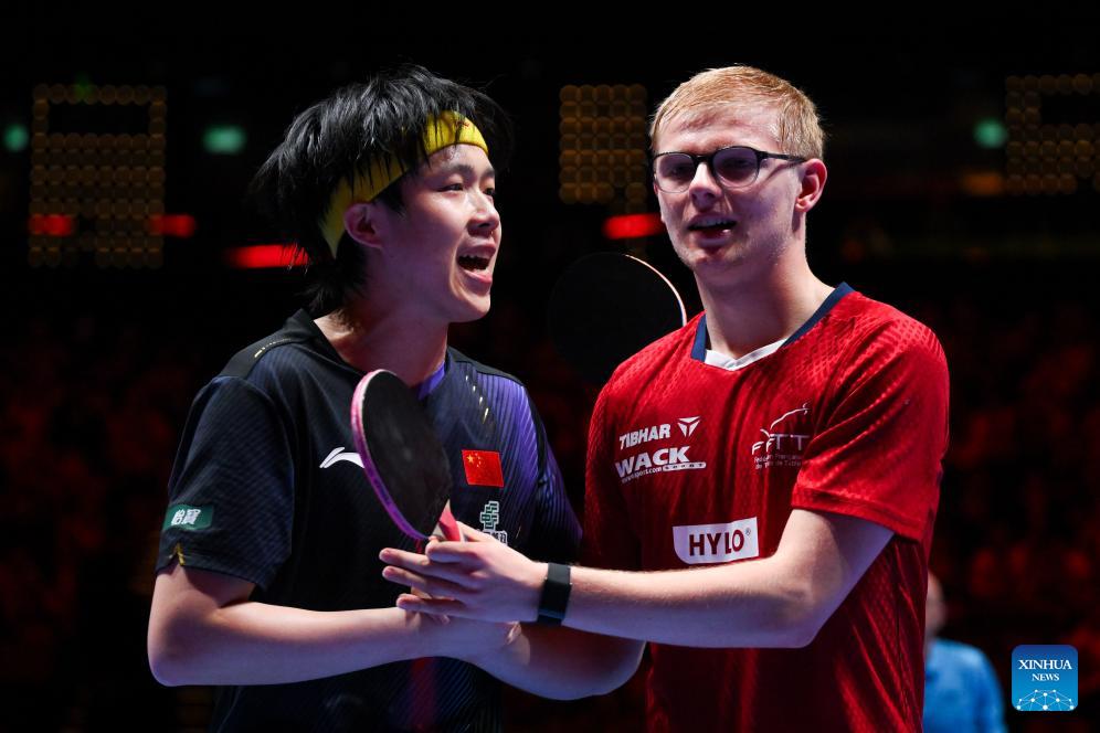Wang Chuqin (L) greets Felix Lebrun after the men's singles round of 16 match between Wang Chuqin of China and Felix Lebrun of France at the ITTF Men's and Women's World Cup 2026 in Macao, China, April 3, 2026. (Xinhua/Yu Yang)