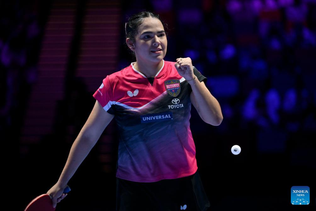 Adriana Diaz reacts after scoring during the women's singles round of 16 match between Adriana Diaz of Puerto Rico and Chen Xingtong of China at the ITTF Men's and Women's World Cup 2026 in Macao, China, April 3, 2026. (Xinhua/Yu Yang)