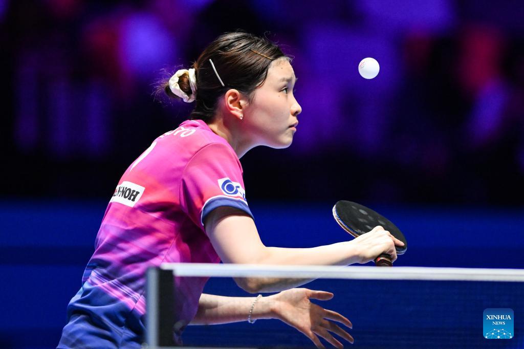 Hashimoto Honoka competes during the women's singles round of 16 match between Bruna Takahashi of Brazil and Hashimoto Honoka of Japan at the ITTF Men's and Women's World Cup 2026 in Macao, China, April 3, 2026. (Xinhua/Cheong Kam Ka)