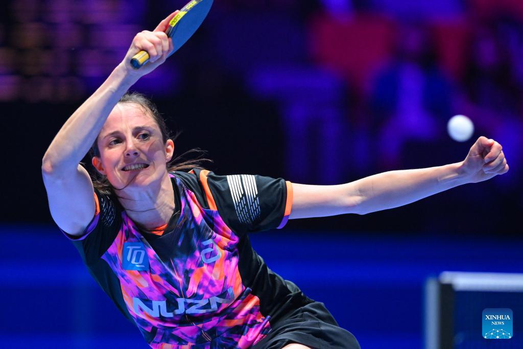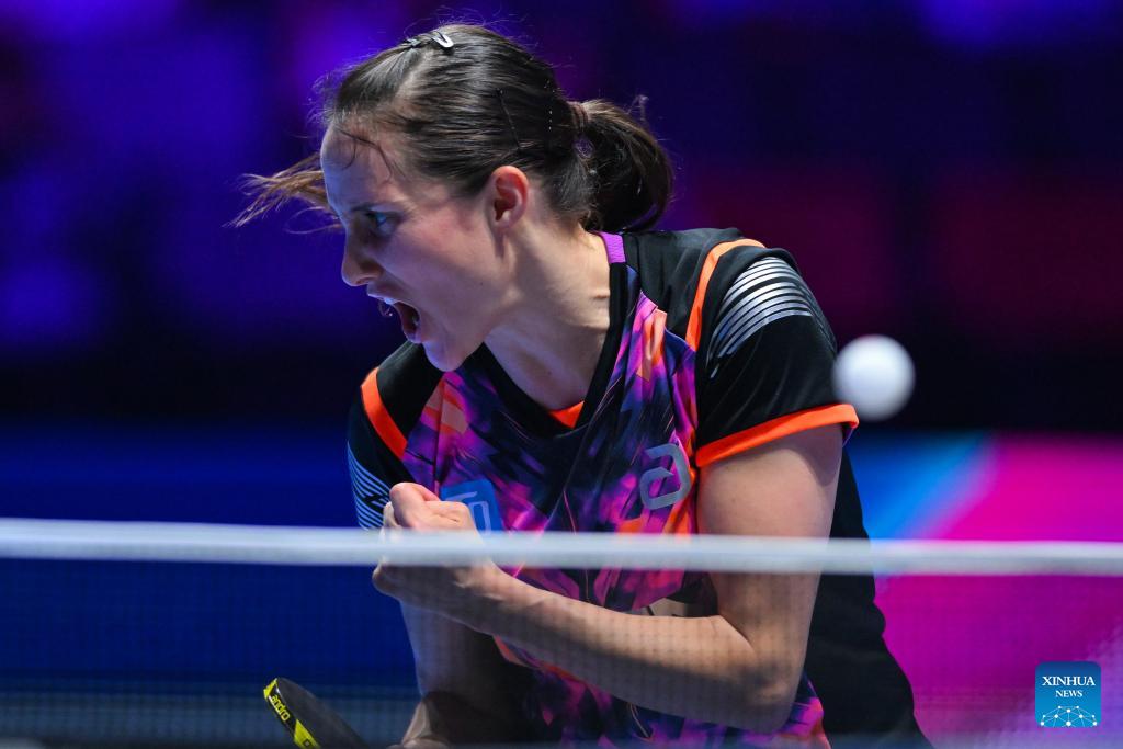 Sabine Winter of Germany hits a return during the women's singles quarterfinal match between Wang Yidi of China and Sabine Winter of Germany at the ITTF Men's and Women's World Cup 2026 in Macao, China, April 4, 2026. (Xinhua/Cheong Kam Ka)