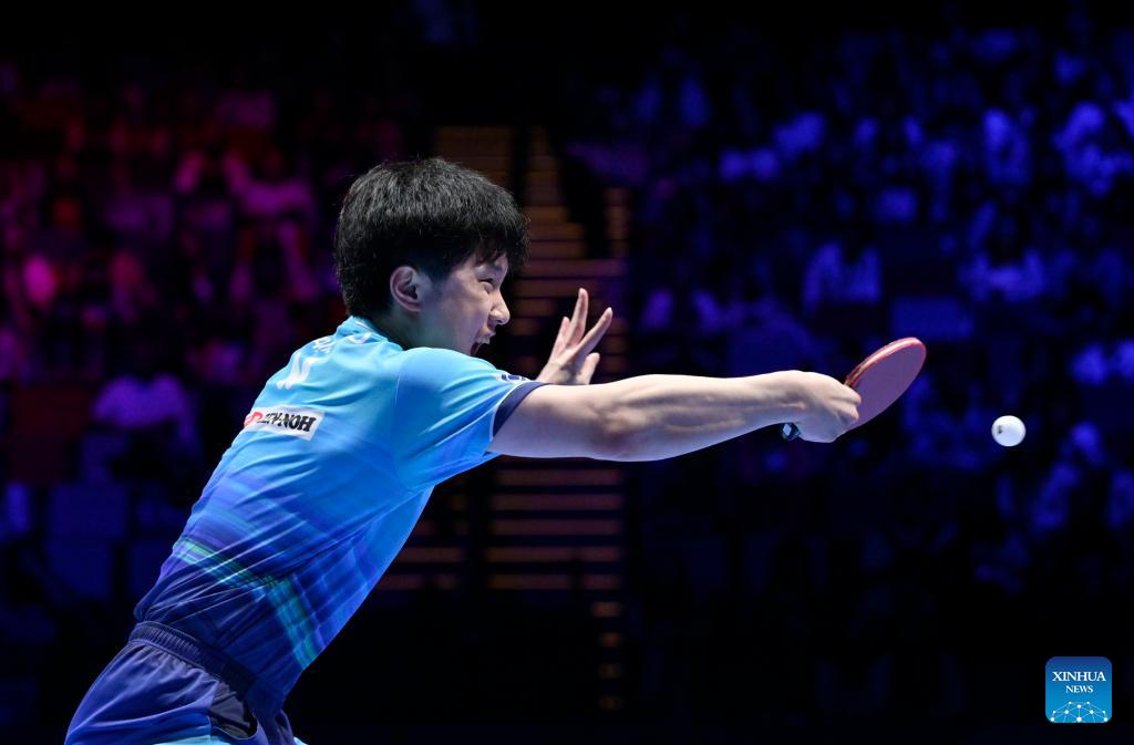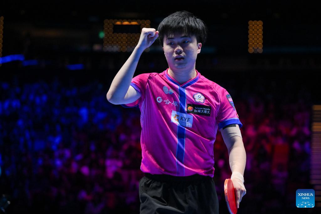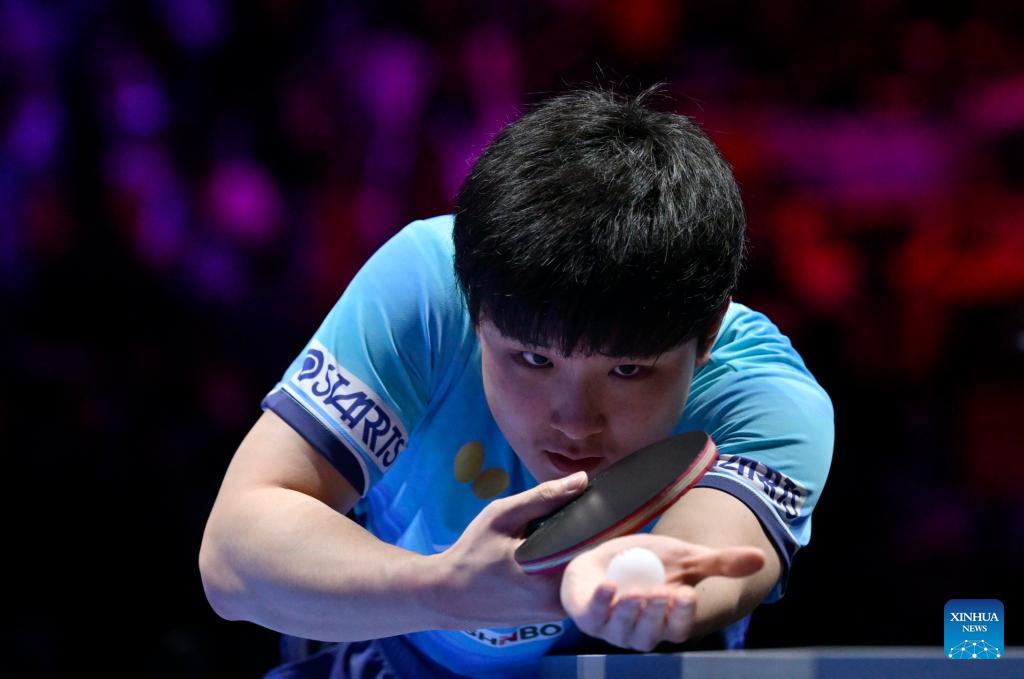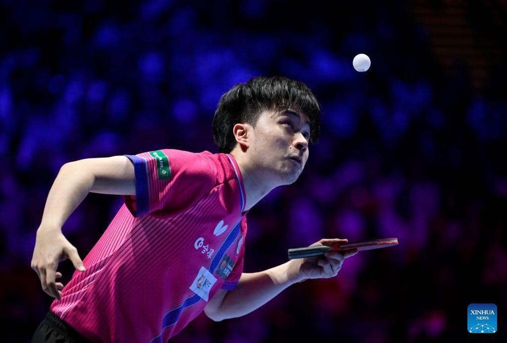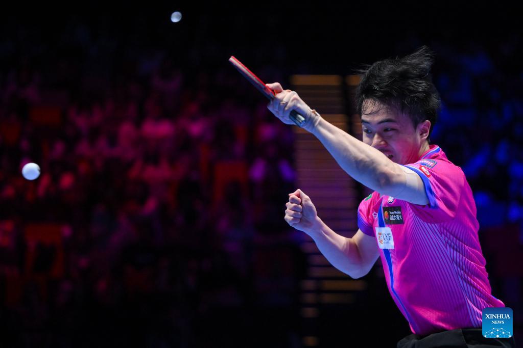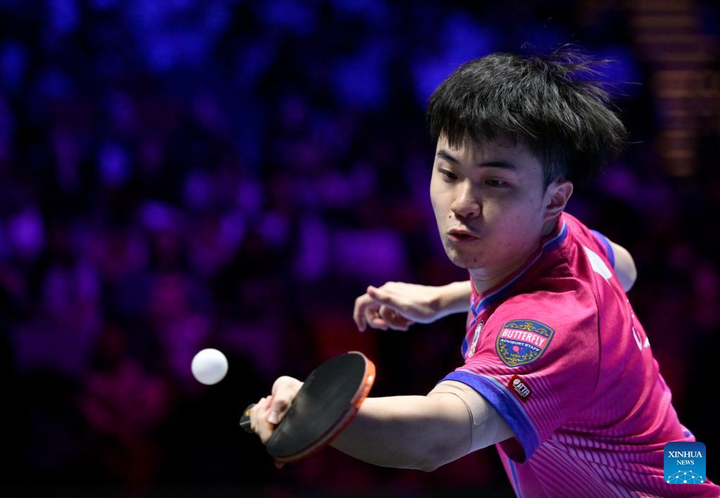 Lin Yun-ju returns a shot during the men's singles quarter-final between Harimoto Tomokazu of Japan and Lin Yun-ju of Chinese Taipei at the ITTF Men's and Women's World Cup 2026 in Macao, China, April 4, 2026. (Xinhua/Yu Yang)