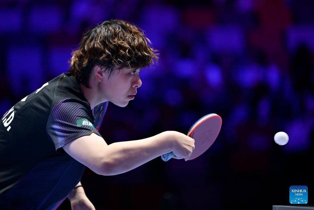 Wang Yidi of China hits a return during the women's singles quarterfinal match between Wang Yidi of China and Sabine Winter of Germany at the ITTF Men's and Women's World Cup 2026 in Macao, China, April 4, 2026. (Xinhua/Yu Yang)