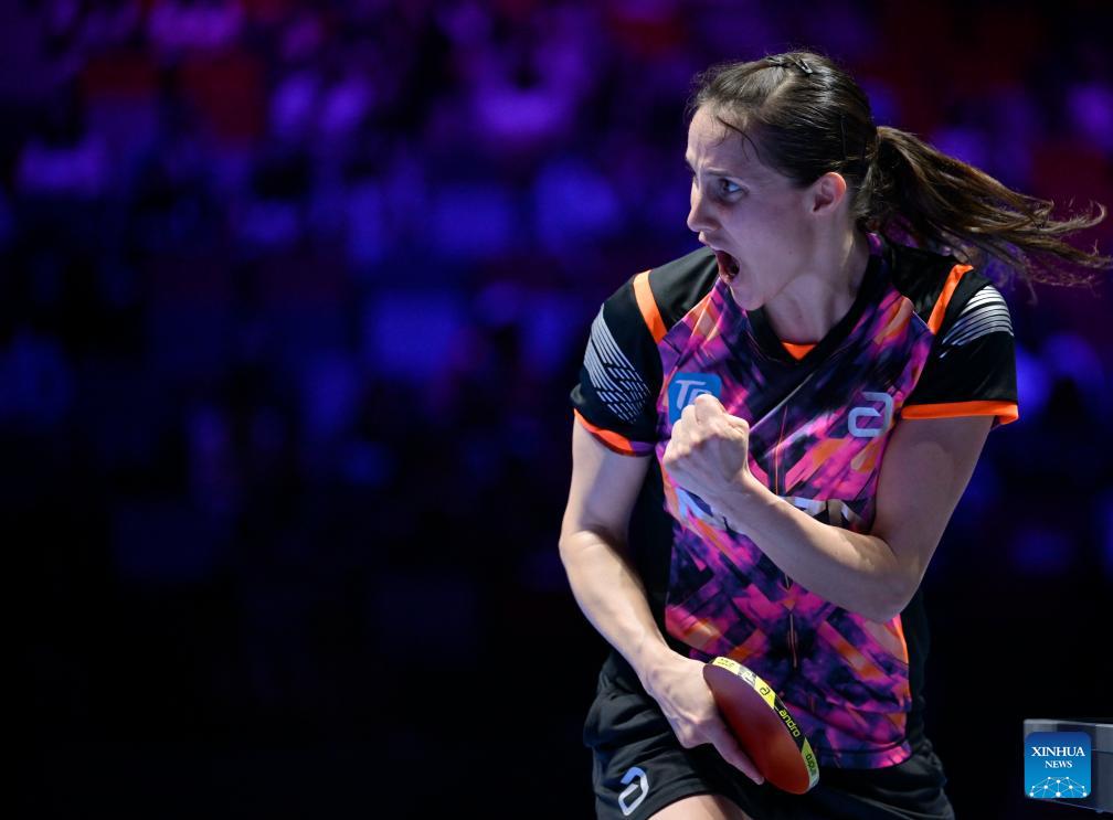 Sabine Winter of Germany celebrates during the women's singles quarterfinal match between Wang Yidi of China and Sabine Winter of Germany at the ITTF Men's and Women's World Cup 2026 in Macao, China, April 4, 2026. (Xinhua/Yu Yang)