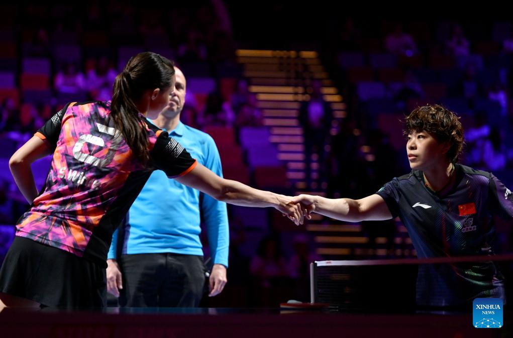 Wang Yidi (R) of China greets with Sabine Winter of Germany before the women's singles quarterfinal match between Wang Yidi of China and Sabine Winter of Germany at the ITTF Men's and Women's World Cup 2026 in Macao, China, April 4, 2026. (Xinhua/Yu Yang)