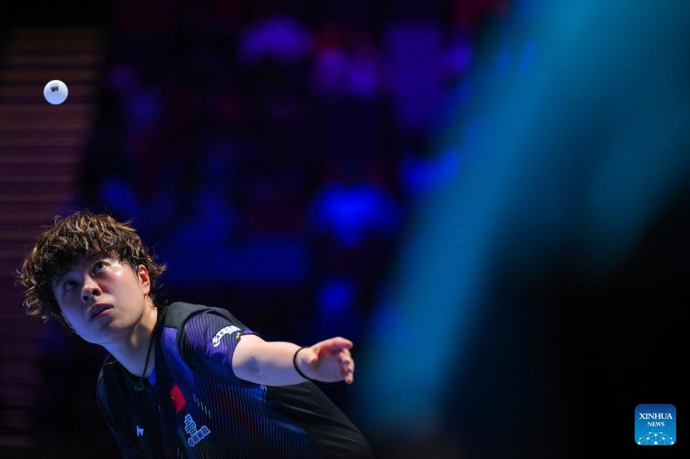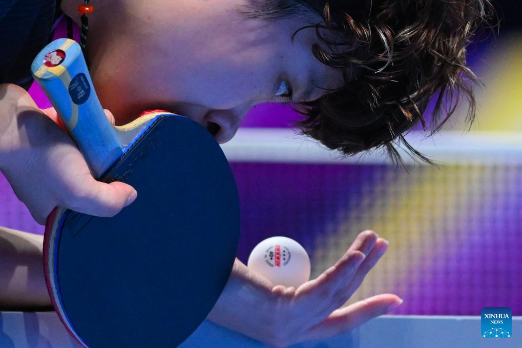Wang Yidi of China serves during the women's singles quarterfinal match between Wang Yidi of China and Sabine Winter of Germany at the ITTF Men's and Women's World Cup 2026 in Macao, China, April 4, 2026. (Xinhua/Cheong Kam Ka)