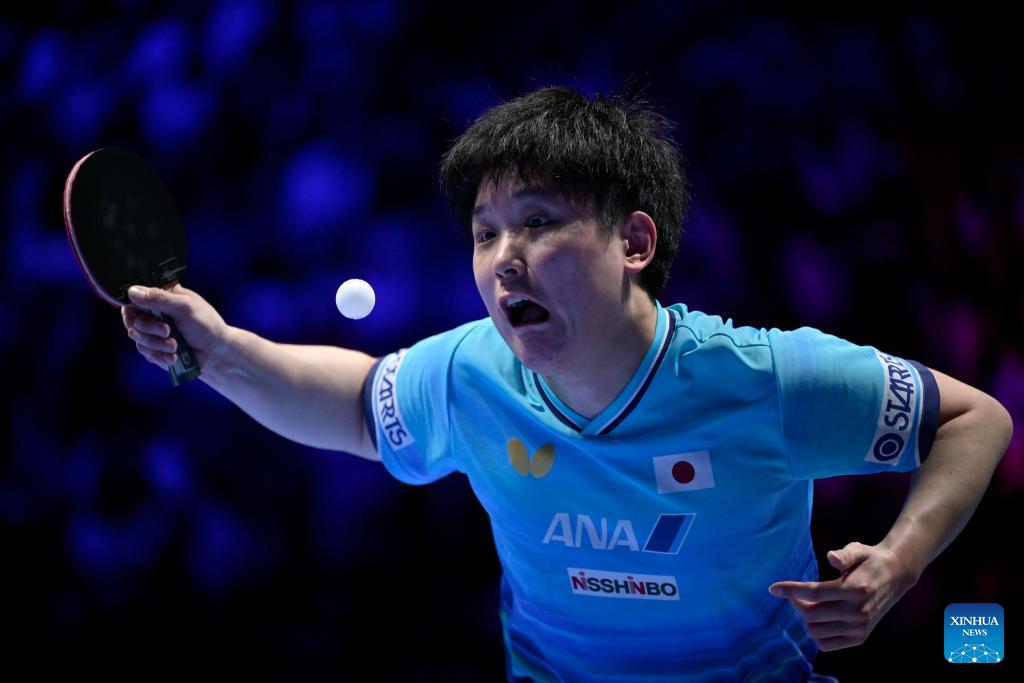 Harimoto Tomokazu of Japan returns a shot during the men's singles quarter-final between Harimoto Tomokazu of Japan and Lin Yun-ju of Chinese Taipei at the ITTF Men's and Women's World Cup 2026 in Macao, China, April 4, 2026. (Xinhua/Yu Yang)