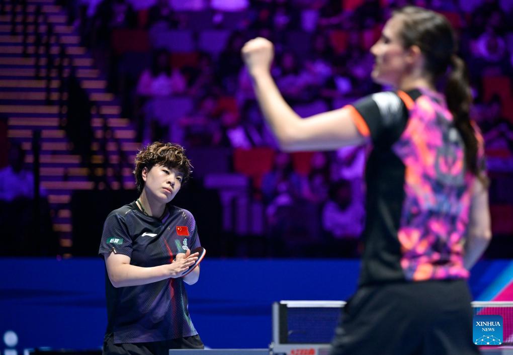 Wang Yidi (L) of China reacts during the women's singles quarterfinal match between Wang Yidi of China and Sabine Winter of Germany at the ITTF Men's and Women's World Cup 2026 in Macao, China, April 4, 2026. (Xinhua/Yu Yang)