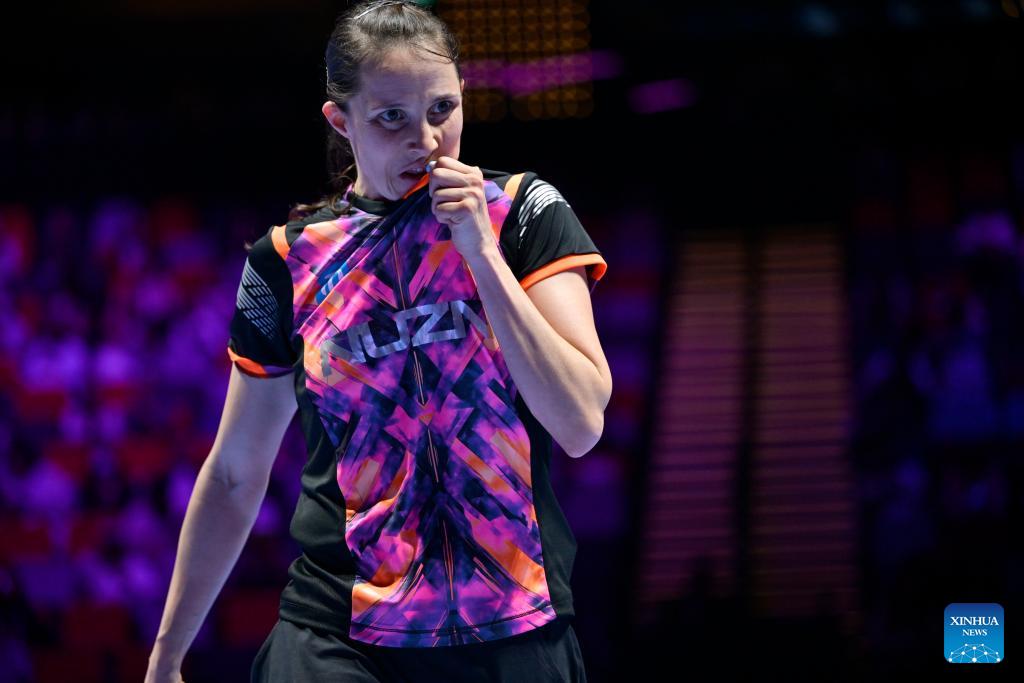 Sabine Winter of Germany reacts during the women's singles quarterfinal match between Wang Yidi of China and Sabine Winter of Germany at the ITTF Men's and Women's World Cup 2026 in Macao, China, April 4, 2026. (Xinhua/Yu Yang)