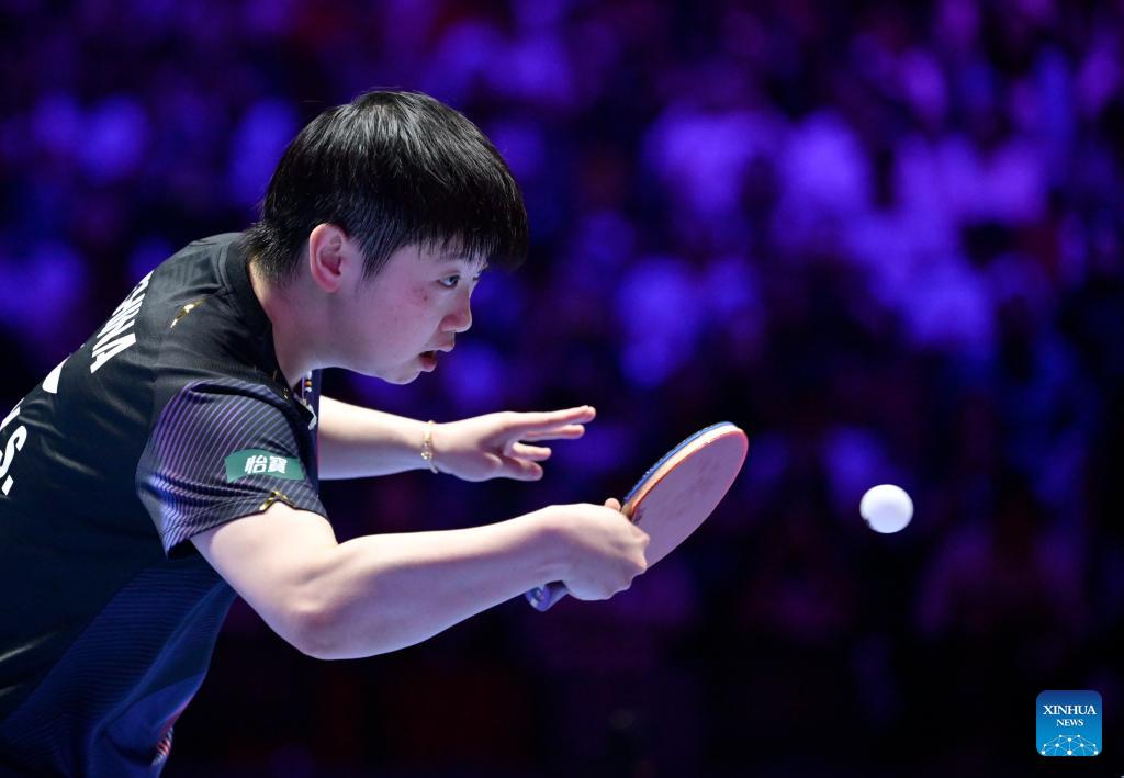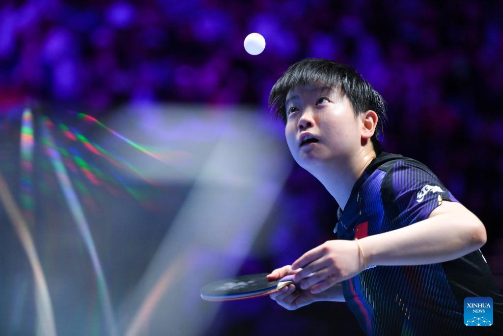 Sun Yingsha of China hits a return during the women's singles semifinal match between Sun Yingsha of China and Sabine Winter of Germany at the ITTF Men's and Women's World Cup 2026 in Macao, China, April 5, 2026. (Xinhua/Yu Yang)