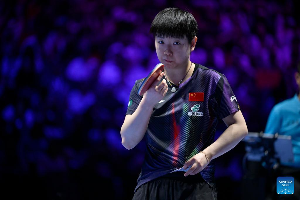 Sun Yingsha of China reacts during the women's singles semifinal match between Sun Yingsha of China and Sabine Winter of Germany at the ITTF Men's and Women's World Cup 2026 in Macao, China, April 5, 2026. (Xinhua/Yu Yang)