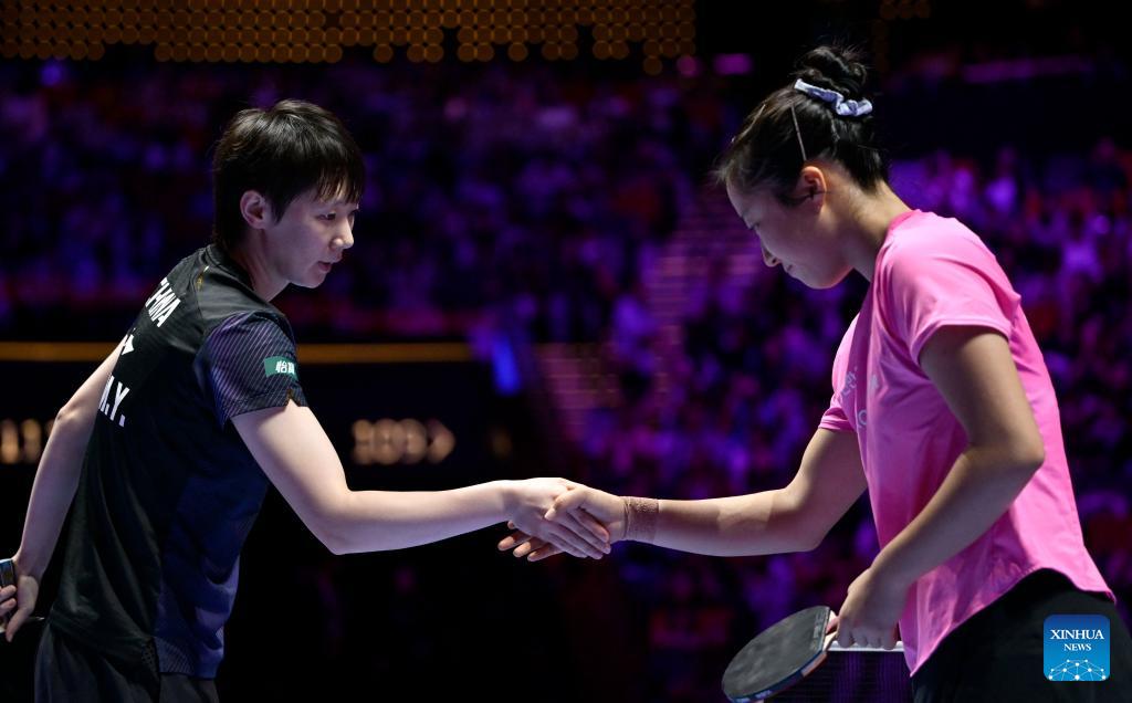 Wang Manyu greets Shin Yu-bin (R) after the women's singles semifinal match between Wang Manyu of China and Shin Yu-bin of South Korea at the ITTF Men's and Women's World Cup 2026 in Macao, China, April 5, 2026. (Xinhua/Yu Yang)