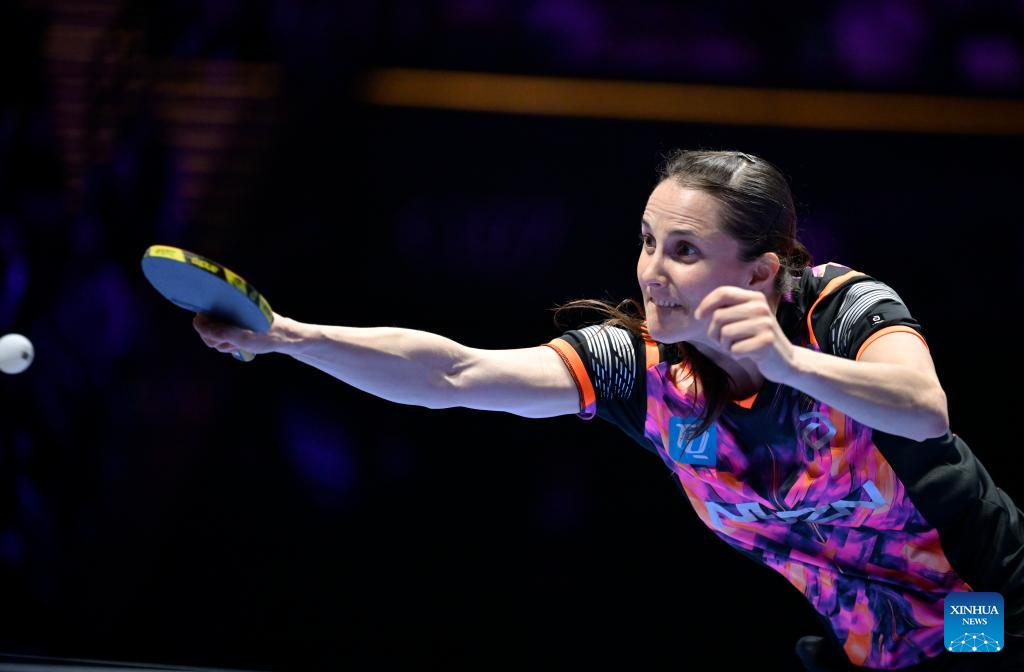 Sabine Winter of Germany hits a return during the women's singles semifinal match between Sun Yingsha of China and Sabine Winter of Germany at the ITTF Men's and Women's World Cup 2026 in Macao, China, April 5, 2026. (Xinhua/Yu Yang)