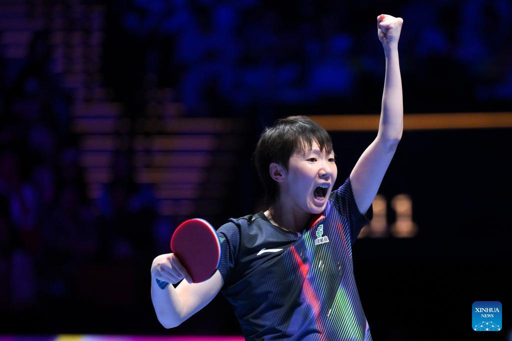 Wang Manyu celebrates during the women's singles semifinal match between Wang Manyu of China and Shin Yu-bin of South Korea at the ITTF Men's and Women's World Cup 2026 in Macao, China, April 5, 2026. (Xinhua/Cheong Kam Ka)